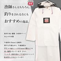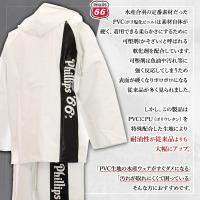 | 「PHILLIPS66 (フィリップスロクロク)」ハイブリッド水産レインシリーズは、PVC(ポリ塩化ビニル)とPU(ポリウレタン)を特殊配合した新素材のハイブリッド生地を使用し、PVCとPUのいいとこ取り(軽い・柔らかい・丈夫・油に強い)を実現 生地厚0.35mmと比較的薄手ながら、生地強度はPVC(ポリ塩化ビニル)の0.4mmものより高くなっている ミシン縫製をできるだけ少なくし、ウェルダー溶着(溶かして圧着)を行うことで防水性をより向上させた完全防水 使用生地・縫製・各部材すべて安心の日本製 漁師さんはもちろん、釣りをされる方にもおすすめな水産レインジャケット