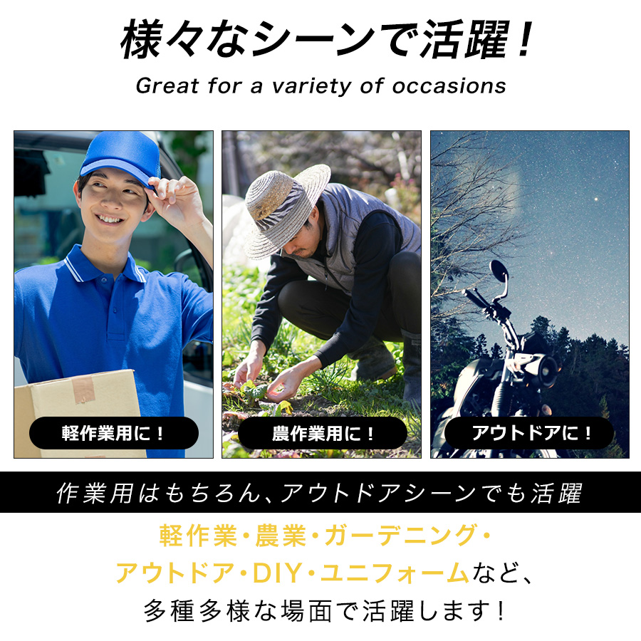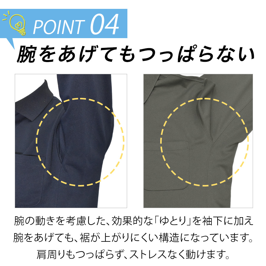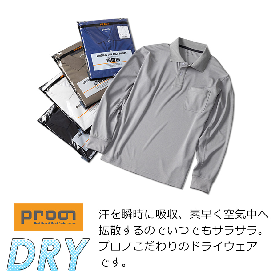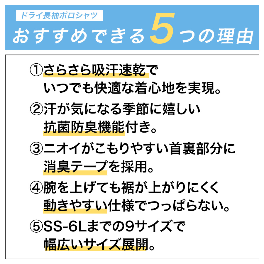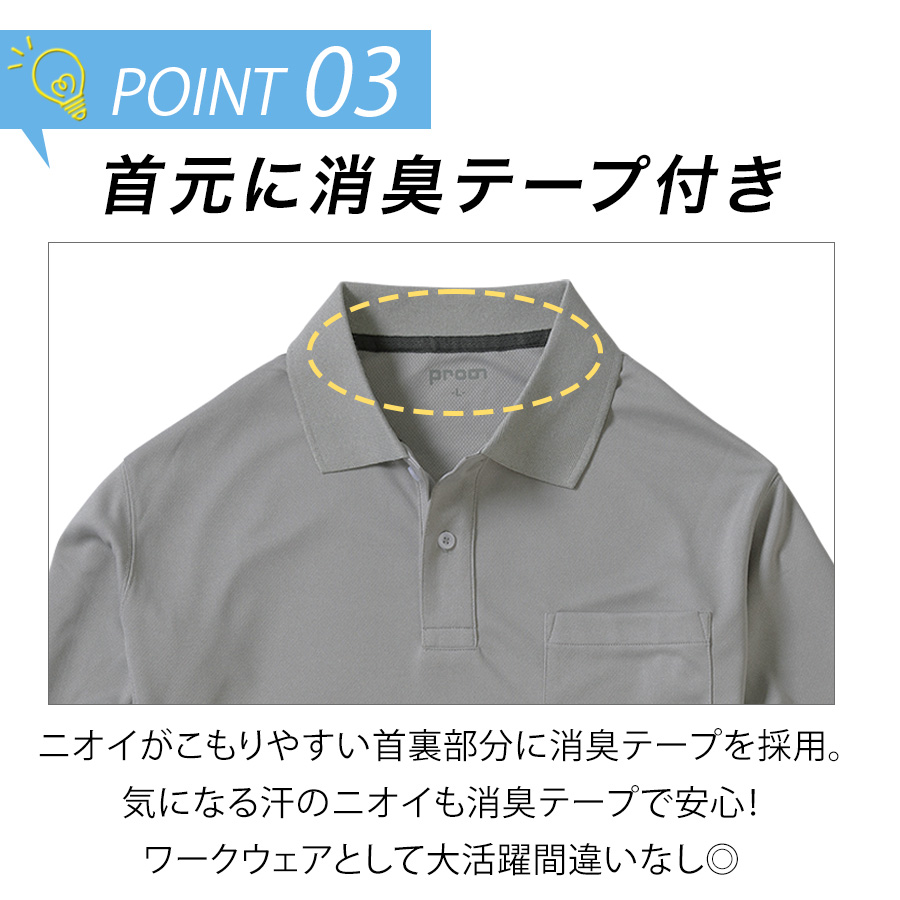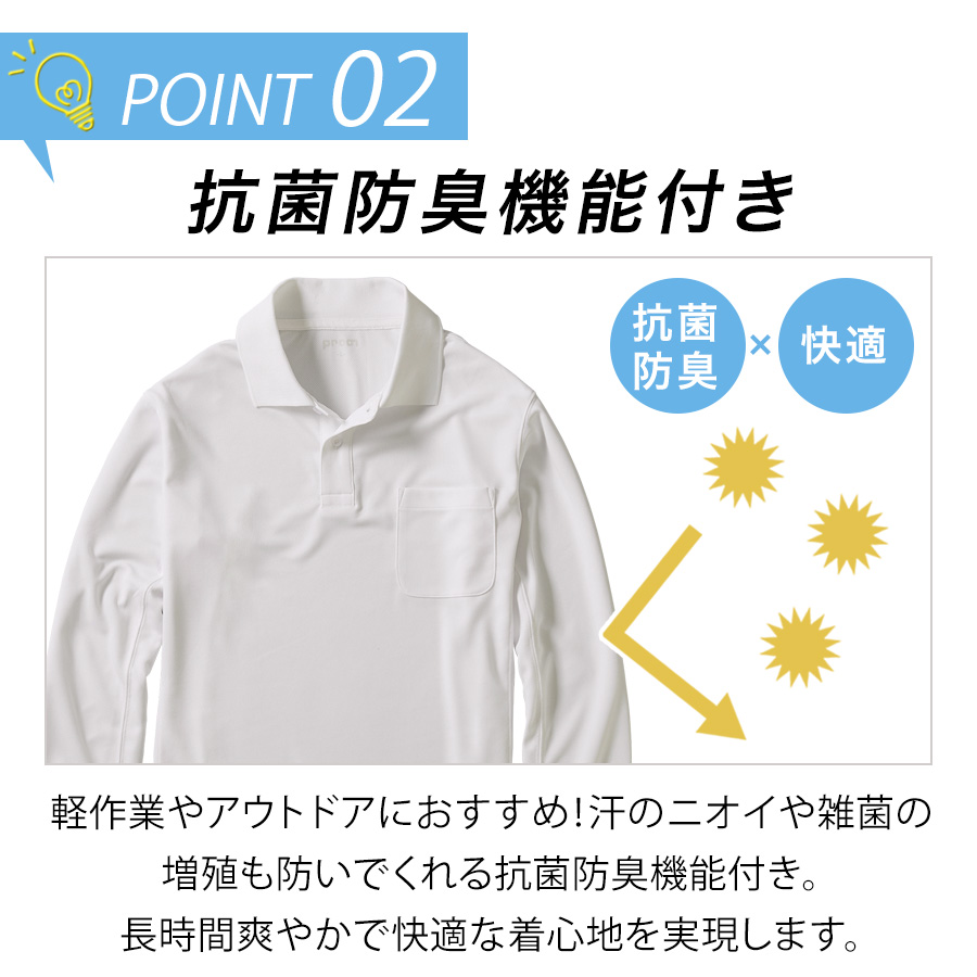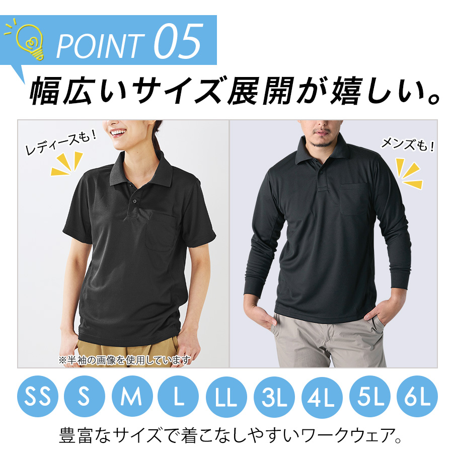 | ポロシャツ 長袖 シャツ 男性 メンズ レディース 吸汗速乾 吸汗 速乾 抗菌防臭 抗菌 防臭 消臭テープ 胸ポケット SS S M L LL 3L 4L 5L 6L 仕事 作業着 作業 ワークウェア 園芸 農業 家庭菜園 運送 現場 DIY キャンプ 釣り バイク ツーリング ユニフォーム シンプル作業 アウトドア 20代 30代 40代 50代 60代 春夏 夏 Prono プロノ ◆商品紹介◆ 汗を瞬時に吸収、素早く空気中へ拡散させるのでいつでも快適な着心地を実現します。 夏や暑い時期の仕事を快適にするDRYウェアです。 【おすすめポイント】 【さらさら吸汗速乾でいつでも快適な着心地】 ポリエステル100%素材なので、汗に濡れても発散しやすくサラサラを保ちます。 洗濯後も乾きやすいのが特徴で、翌朝着たい時に乾いていないと慌てることも少なくなりそうです。 加えて抗菌防臭機能付きだから気になるニオイも軽減してくれるのもポイント! 【嬉しい抗菌防臭機能付き】 軽作業やアウトドアにおすすめです。 吸汗速乾生地を採用しているので、汗のニオイや雑菌の増殖も防いでくれる抗菌防臭機能と合わせて◎ 長時間、快適な着心地を実現してくれます。 【消臭テープ付きで安心】 ニオイがこもりやすい襟ぐり部分に!気になる汗のニオイも消臭テープ付きで安心! 暑い時期のワークウェアとして大活躍間違いなしの1枚です。 【腕をあげても裾が上がらず快適】 腕の動きを考慮した、効果的な「ゆとり」を袖下に加え腕をあげても、裾が上がりにくい構造になっています。肩周りもつっぱらず、ストレスなく動けます。 【幅広いサイズ展開が嬉しい】 SS-6Lまでの豊富な9サイズ展開がポイントです。 また、左胸のポケットがワンポイントの無駄のないシンプルなデザインも魅力です。 汗によるべたつきの軽減、動きやすさ、着心地のよさを求める全ての方へおススメ致します! |