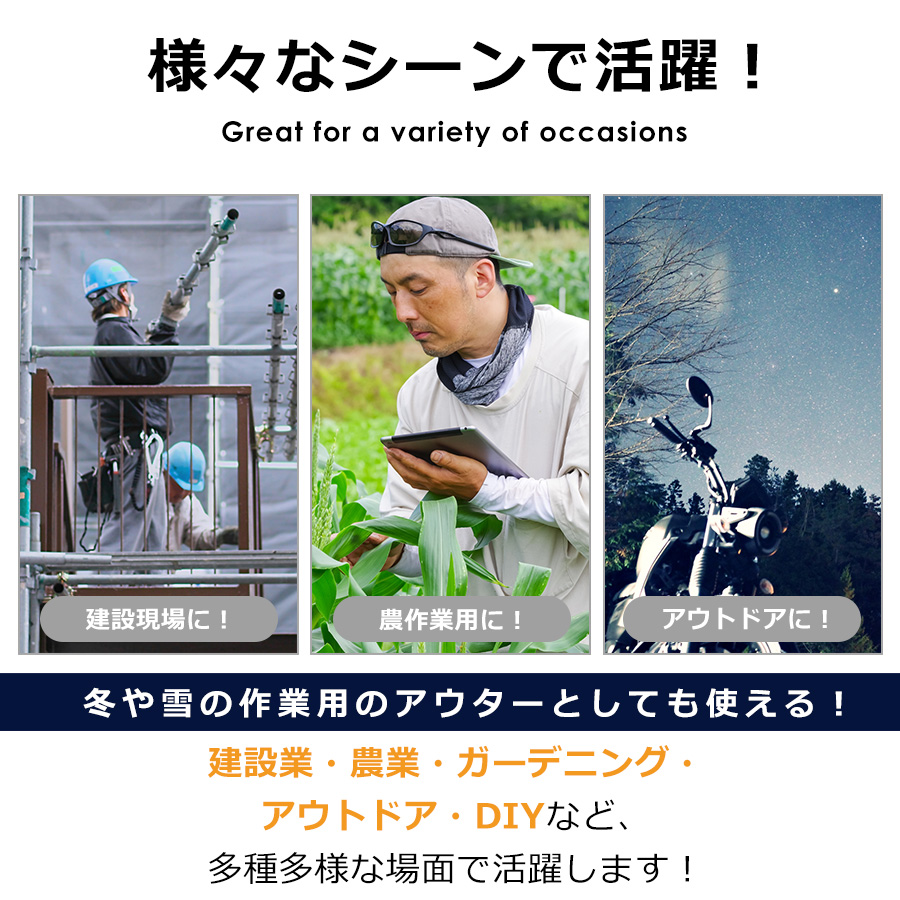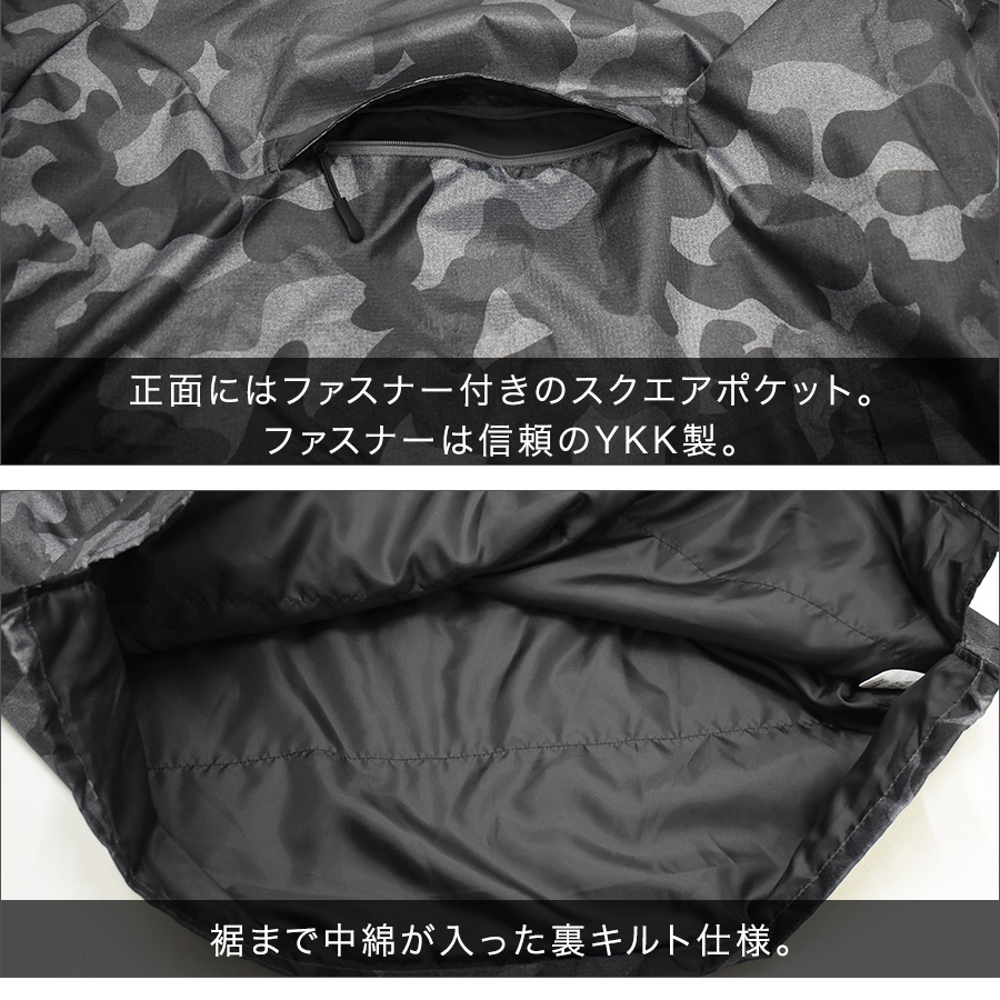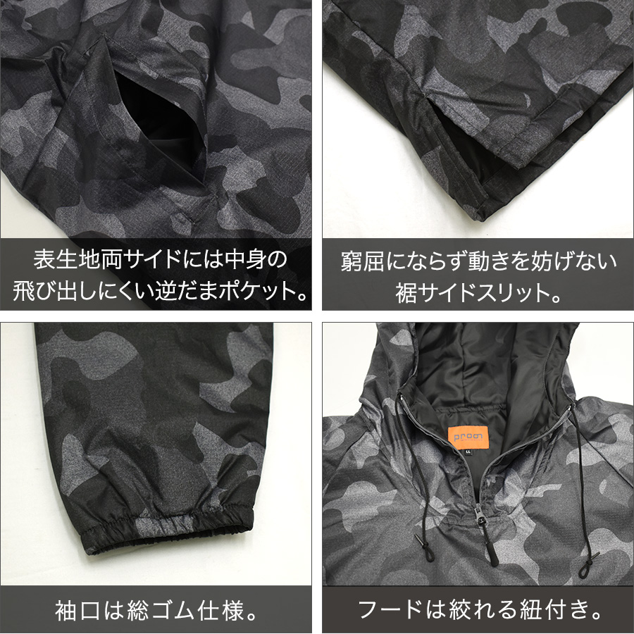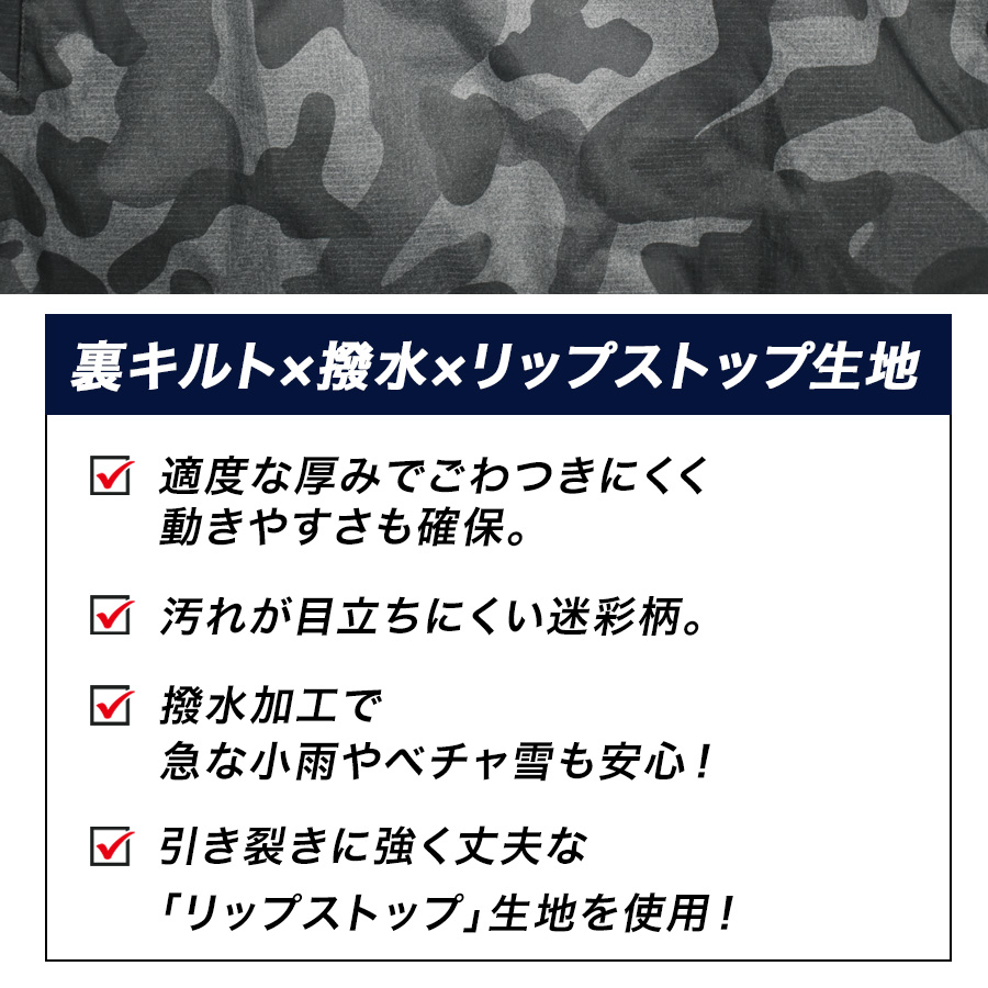 | 男性 メンズ 防寒 防寒着 防寒対策 ジャケット ブルゾン ヤッケ ジャンパー フード M L LL 3L 4L 除雪作業 雪の日 通勤 仕事 作業着 作業 真冬 撥水 はっ水 あったかい 手洗い可能 迷彩 ミリタリー カモフラ カモフラージュ ブラック オリーブ カーキ 緑 黒色 黒 緑色 建設 現場 農作業 ガーデニング DIY キャンプ 釣り バイク アウトドア 20代 30代 40代 50代 60代 2024AW 秋冬 冬 プロノ Prono ◆商品紹介◆ プロノオリジナルの中綿入り防寒ヤッケが迷彩柄になって登場! 裏地はキルト素材になっており、温かいのが◎ 適度な厚みでごわつかず、動きやすさも確保しているので、作業用のアウターとして活躍してくれます。 表地には格子状に丈夫な糸を使用した引き裂きに強い「リップストップ」生地を採用。 軽くて丈夫なナイロン素材を使用しました。 もし破れてしまったとしても、穴が広がりにくいのも嬉しいポイントです。 お尻が隠れる長めの丈で腰冷えを防いでくれます。 撥水加工を施しているので急な小雨やベチャ雪も安心です。 ※防水ではありませんので長時間濡れる状況でのご使用は浸水の可能性がございます。ご注意ください。 迷彩柄は汚れが目立ちにくいので、現場作業でも安心して着られます! さらに、手洗い可能なので、いつでもキレイな状態を保つことができます。 プライベートウェアとしてはもちろん、建設業・農業・ガーデニング・アウトドア・DIYなど、多種多様な場面で活躍します! |