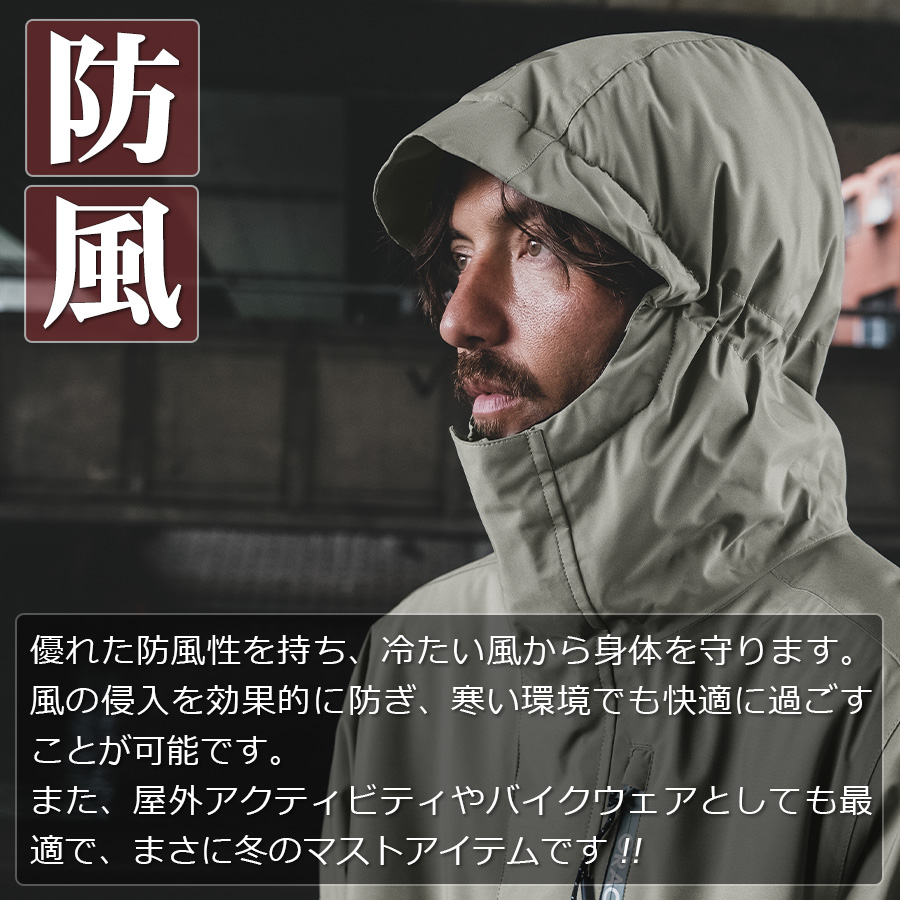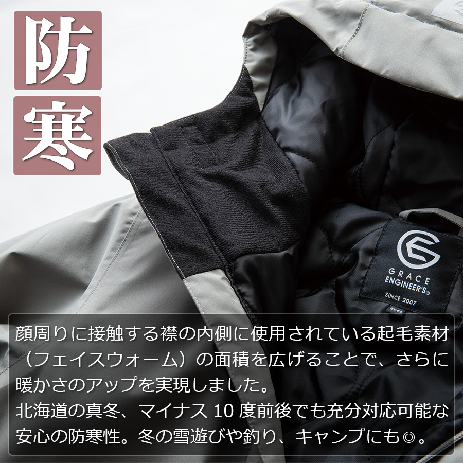 | 防寒 ツナギ 作業服 ヒップオープン 中綿 キルティング 防風 防水 極寒 真冬 あったかい 生地防水 釣り バイク 野外作業 スノボ ボードウェア ウインター キャンプ ◆商品紹介◆ 不動の人気モデルがさらなる進化を遂げました。 防風性と防水性に優れた耐水圧15,000mm、透湿度5,000g/m2・24hを誇るハイスペックな生地に、キルティング中綿を採用し、抜群の保温性を実現しました。 特に注目すべきは、ツナギの弱点を克服した便利なヒップオープン機能『GRACE BACK(グレースバック)』。 この機能をはじめ、快適さを追求した多彩な機能が随所に散りばめられています。 厳しい寒さの中でも快適に作業ができるだけでなく、ウインターキャンプや釣り、バイクなどのアクティビティ等、冬の必携アイテムとして、ぜひお試しください。 【前モデル GE-590からの進化】 ・より洗練されたデザイン&カラーになりました。 ・便利な内ポケット・・・片胸のみから両胸に仕様変更しました。 ・フェイスウォーム・・・顔周りに触れる襟内側起毛素材(フェイスウォーム)の面積を拡大し、より暖かくなりました。 ・トイレに便利なヒップオープン・・・特許取得「グレースバック」に進化し、開け閉めの度に腰帯がめくれ上がる心配がなくなりました。 ・膝タック・・・タックを深くし、足の曲げ伸ばしがよりスムーズになりました。 <<防寒>> 顔周りに接触する襟の内側に使用されている起毛素材(フェイスウォーム)の面積を広げることで、さらに暖かさのアップを実現しました。 北海道の真冬、マイナス10度前後でも充分対応可能な安心の防寒性。冬の雪遊びや釣り、キャンプにも◎。 <<防水>> 耐水圧15,000mmは、非常に高い水圧に耐えることができるため、激しい雨や雪の中でも内部に水が浸入する心配がありません。 また、透湿度5,000g/m2・24hは、内部の湿気を外に逃がす能力を示しており、汗や体温による蒸れを軽減し、快適な着心地を保ちます。 <<防風>> 優れた防風性を持ち、冷たい風から身体を守ります。風の侵入を効果的に防ぎ、寒い環境でも快適に過ごすことが可能です。 また、屋外アクティビティやバイクウェアとしても最適で、まさに冬のマストアイテムです!! <<ヒップオープン機能『GRACE BACK』>> 特許取得のヒップオープン機能「グレースバック」で、ツナギの弱点を見事に克服。 トイレに行く際の煩わしさが大幅に軽減されます。 開け閉めのたびに腰帯がめくれ上がる心配がなくなります。 <<収納力、倍増>> 片胸のみの内ポケットだった旧モデルから、両胸に仕様変更し、さらに収納の利便性がアップ! 必要な小物や貴重品を両胸に収納、取り出すことができ、作業効率も向上し、より快適にお使いいただけるようになりました。 <<膝がスムーズ>> 膝タックを旧モデルよりさらに深くし、足の曲げ伸ばしがよりスムーズに行えるようになりました。 膝の可動域が広がることで、つっぱらず、より自然な動きをサポートします。 ※ジャケットフード部の反射プリントは順次プリントデザインが変更となります。 ※実店舗ではお取り扱いが無い場合がございます。 店舗での取り扱いの有無に関しては直接店舗へお問い合わせをお願いいたします。 |