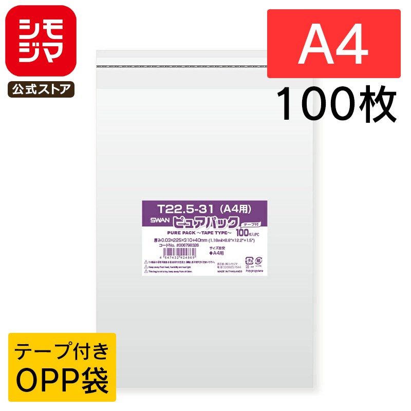 OPP袋 透明袋 A4用 テープ付き 100枚入 ピュアパック 厚0.03×幅225×高310+テープ部分40mm シモジマ SWAN T 22.5-31(a4用)