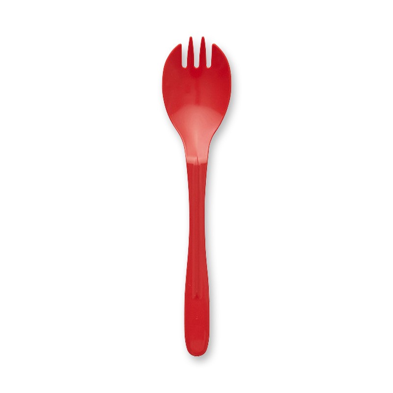 ○プラスチック製の使い捨てフォークスプーン。カレーライス、丼物等に活用できる、しっかりとした作りです。珍しい赤色で、食卓やパーティに彩を加えてくれます。100本入り。