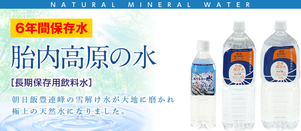 「胎内高原の水」はナチュラルミネラルウォーターです。飯豊朝日連峰の大地が育んだ天然のミネラル成分を含み、人工添加や成分加工を一切していない、自然本来のおいしさを生かした安全な水です。