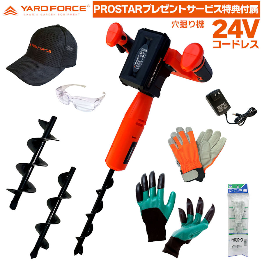 力いらずで女性でも簡単に穴掘りが出来る「YARDFORCE 24Vコードレス穴掘り機」とPROSTARがあると便利な付属品を特別サービス添付しセット商品化したPROSTARオリジナルパック【Prostar/Pack】です。