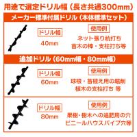 用途にあわせて別売ドリルも追加できるので、野菜などの細い支柱立てから植樹・種まき穴あけなど、杭棒打ちや柵・ハウスの設置穴あけまで様々使用が出来て家中で大活躍する電動穴掘り機です!