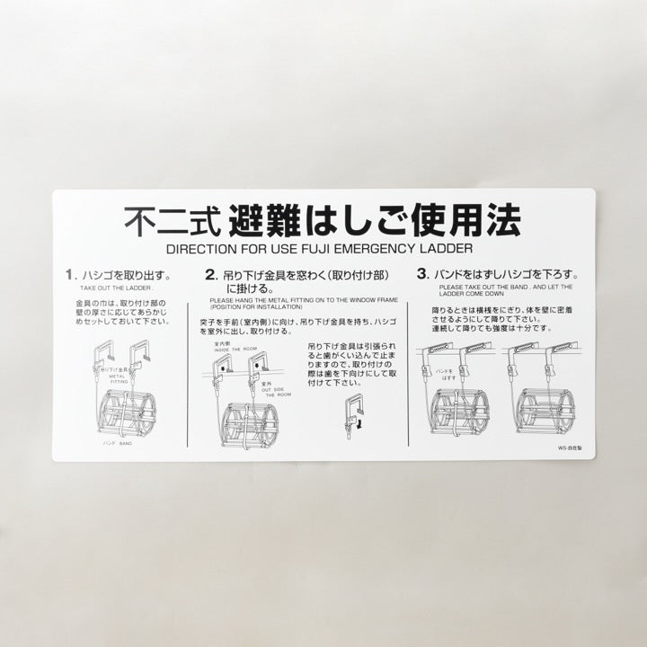 城田鉄工製「ワイヤロープ式はしご 自在フック型用 使用法銘板(WS-自在)」は、ワイヤロープ式避難はしご(自在フック型)の正しい使用方法を示すための表示板です。