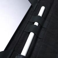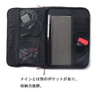 内側には、ジップ付きのメッシュポケット、名刺やカードを収納できるマルチポケット、ペン差しを配置。もう1室には、タブレット固定できるバンドと、書類を入れられるポケットを配置しています。