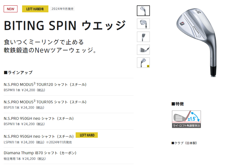 BRIDGESTONE GOLF BITING SPIN WEDGE / ブリヂストン バイティング スピン ウエッジ 2024年モデル シャフト4種(MODUS3 TOUR120/105/N.S.PRO 950GH neo/Diamana)