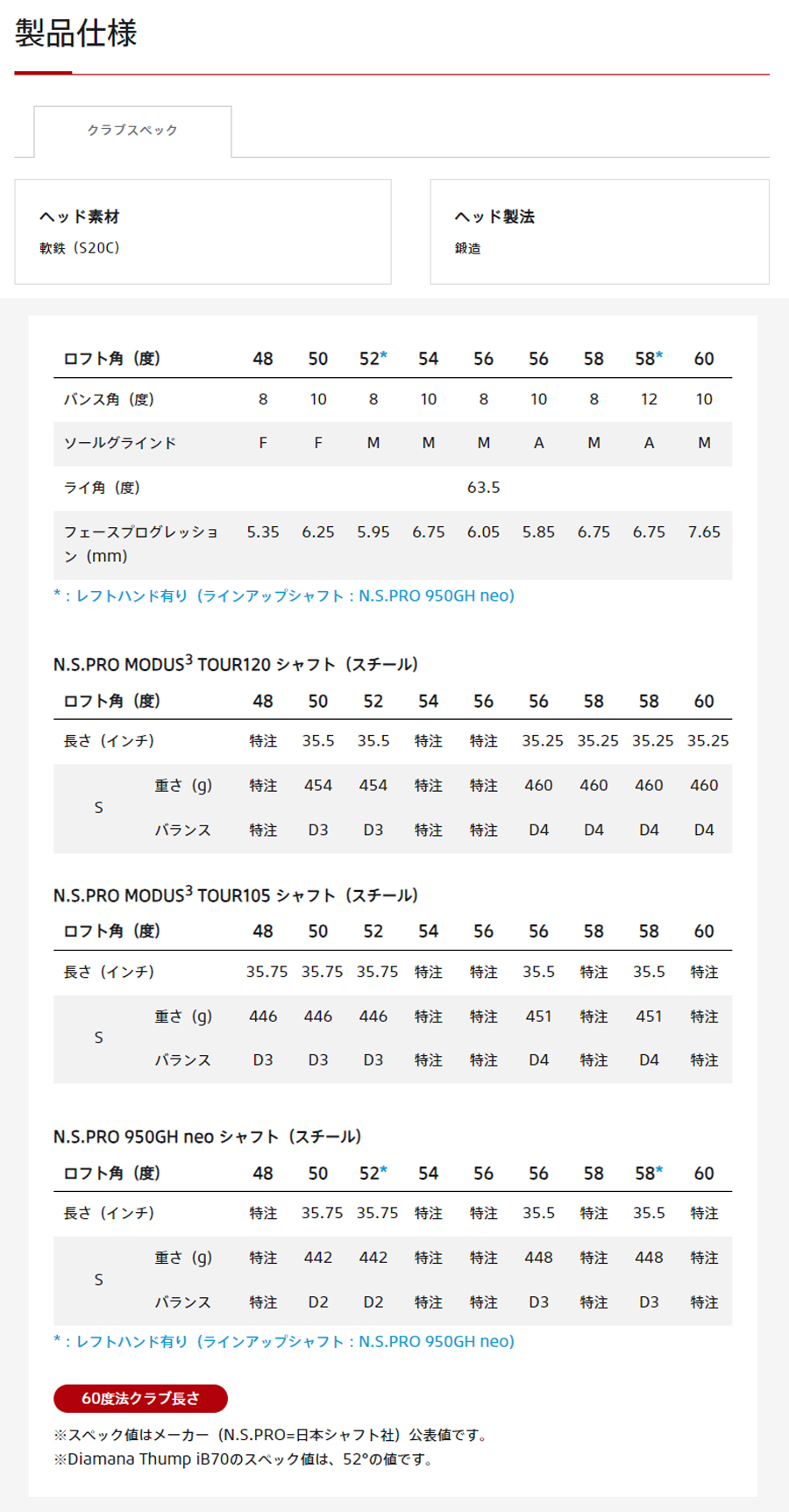 ロフト角/バンス角/ソールグラインド:48°/8°/F、50°/10°/F、52°/8°/M、54°/10°/M、56°/8°/M、56°/10°/A、58°/8°/M、58°/12°/A、60°/10°/M