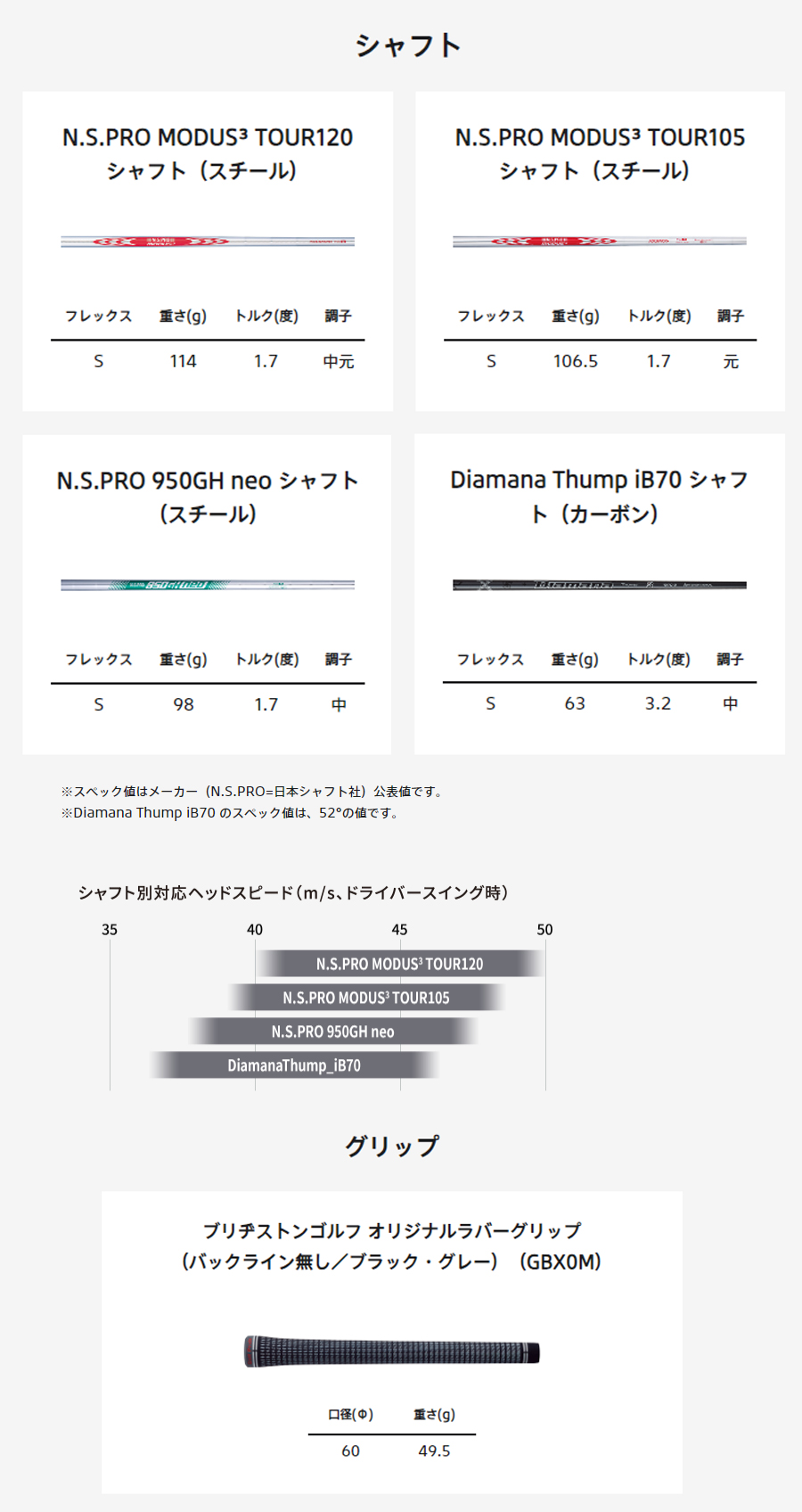 シャフト:N.S.PRO MODUS3 TOUR120 シャフト(スチール)/S、N.S.PRO MODUS3 TOUR105 シャフト(スチール)/S、N.S.PRO 950GH neo シャフト(スチール)/S、Diamana Thump iB70 シャフト(カーボン)/S