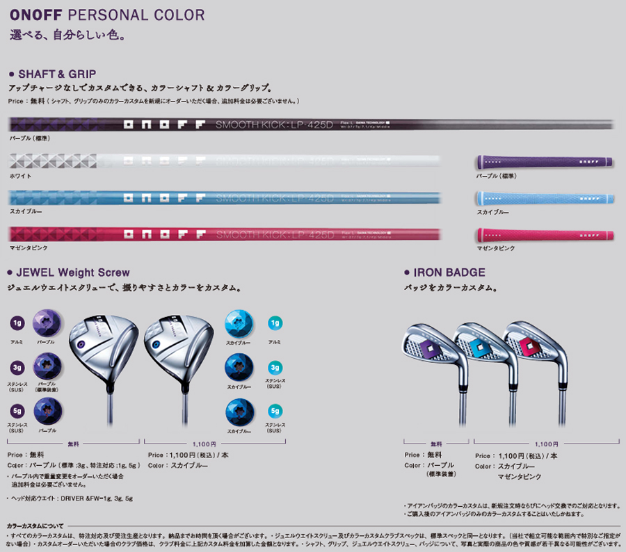 自分らしいカラーが選べるオノフレディの豊富なカラーカスタム。アップチャージなしで選べる4色のシャフトと3色のグリップをカスタマイズ。