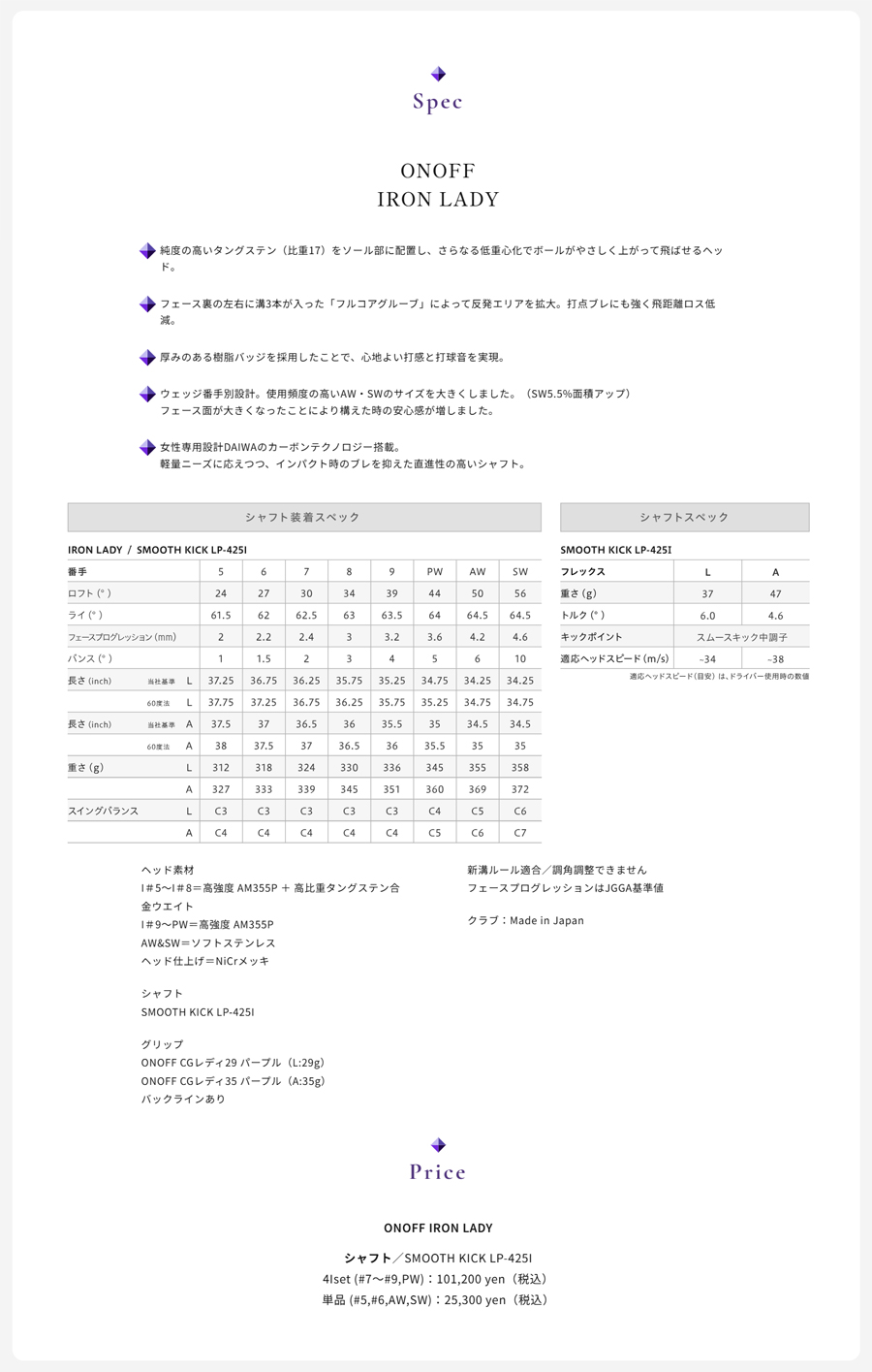 ONOFF IRON LADY CUSTOM / オノフ アイアン レディ 4本セット(#7-9,PW) 2025年モデル カラーカスタム SMOOTH KICK LP-425I レディース アイアンセット 受注生産