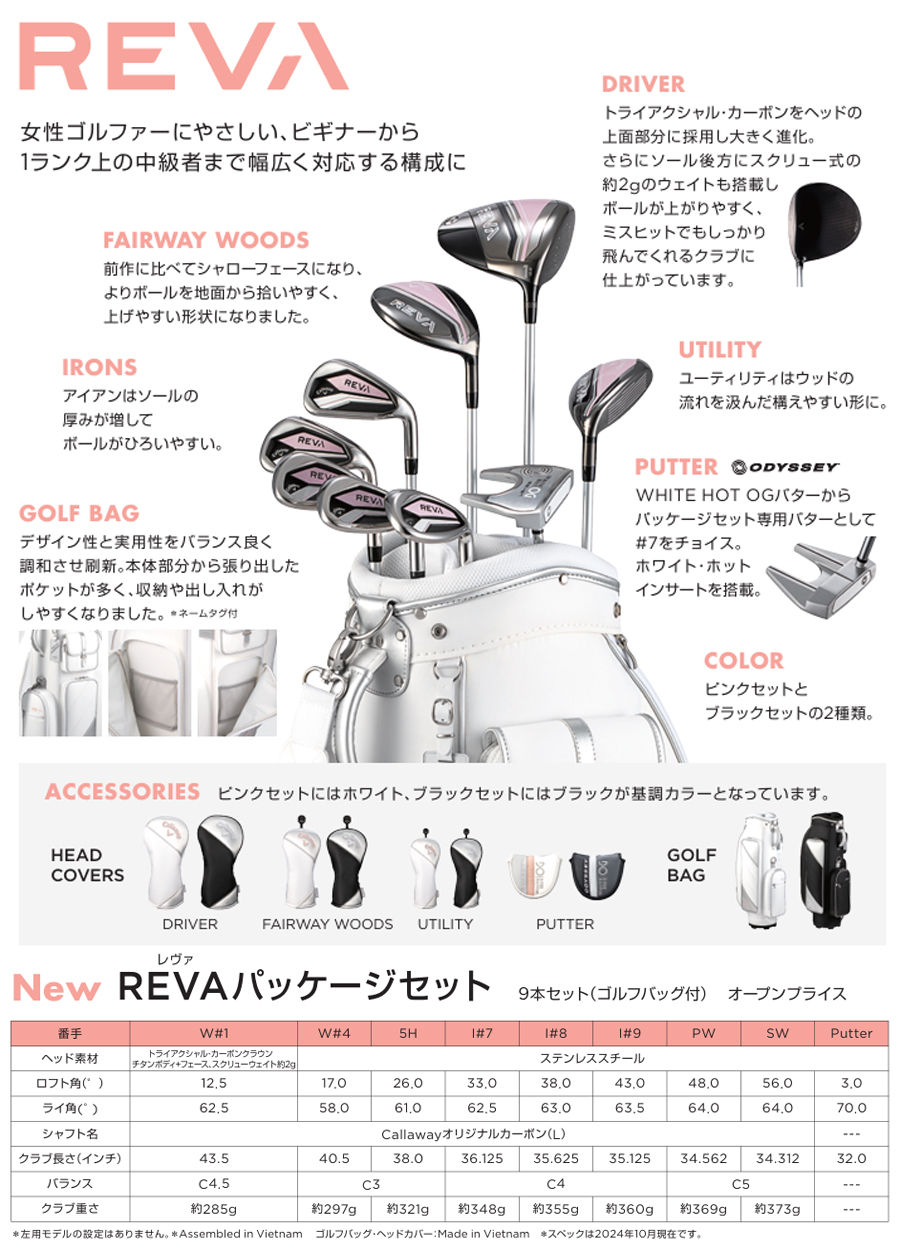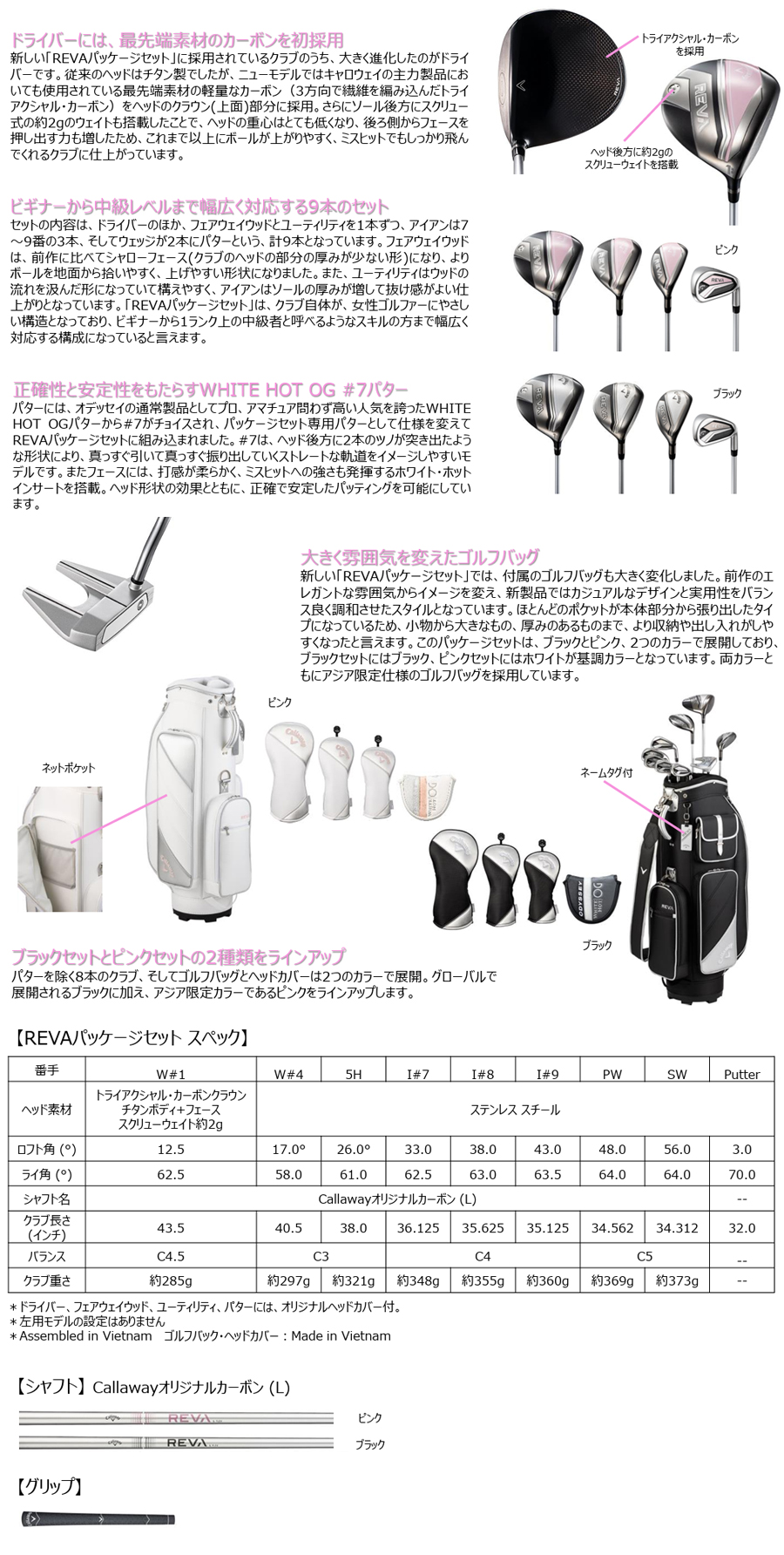 Callaway キャロウェイ キャロウェイゴルフ ゴルフブランド ゴルフクラブ REVA レヴァ レバ GOLF ゴルフ 2024 2024年 2024年モデル 人気 話題 ランキング おすすめ かわいい Package Set パッケージセット ゴルフクラブセット クラブセット セットクラブ キャディバッグ付き 9本セット 9本組 セット ドライバー フェアウェイウッド FW ユーティリティ UT アイアンセット アイアン パター WHITE HOT OG #7 BLACK ブラック 黒 PINK ピンク LADIES レディース レディス WOMEN'S ウィメンズ 女性 女性用 送料無料