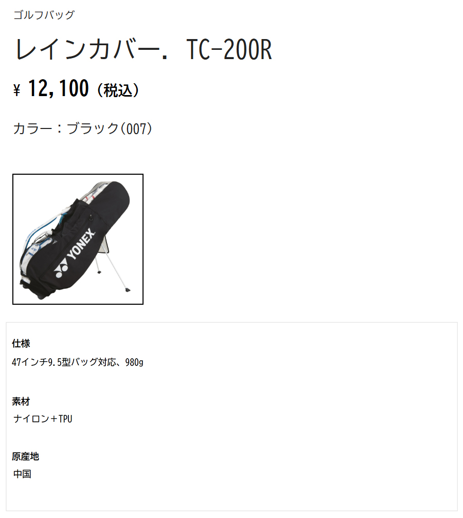 YONEX TC-200R / ヨネックス レインカバー ブラック 2023年モデル 軽量 シンプル キャディバッグカバー メンズ レディース 雨除け