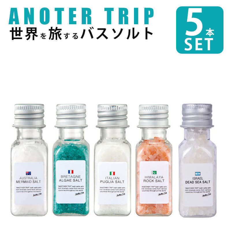 「もう一つの旅」をコンセプトとした「ANOTHER TRIP」バスソルトシリーズの1本使い切りタイプ。人気のアルグソルトやヒマラヤロックソルトも入った5か国のバスソルトセット。