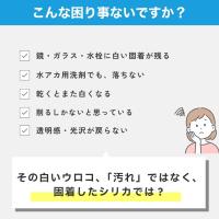 鏡やガラスのウロコ、水回りの白濁など、シリカが関与する固着汚れの除去に適しています。