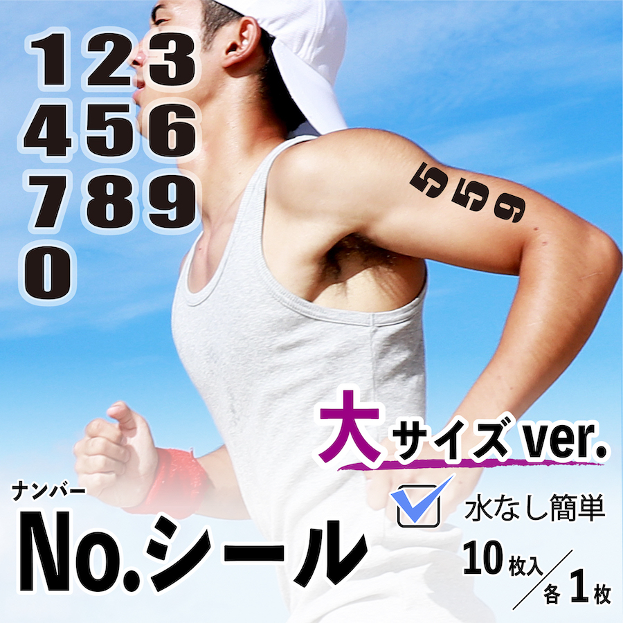 Noシール 大 10枚組 水無しで貼れる タトゥーシール ナンバー 数字 ゼッケン ボディシール シンプル フェス イベント マラソン トライアスロン nos2
