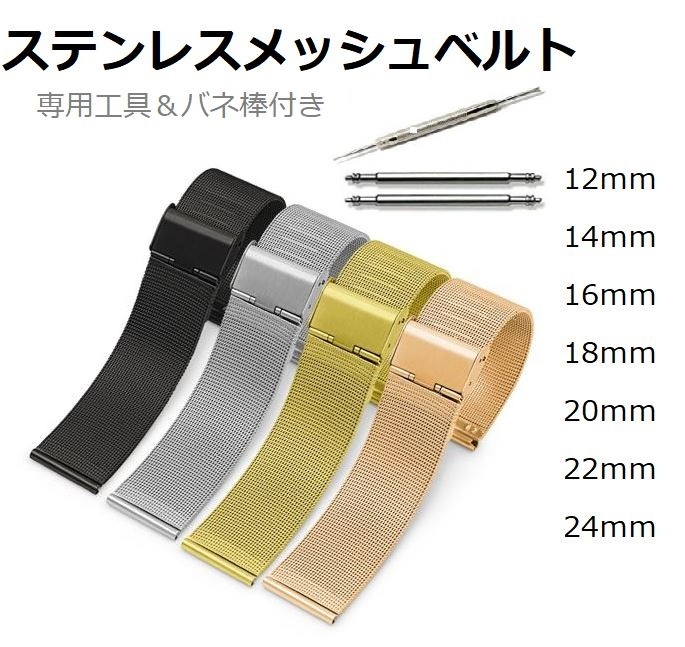 商品名:腕時計 ベルト 交換 ステンレス製 バンド メッシュ スライド 工具付 12mm 14mm 16mm 18mm 20mm 22mm 24mm