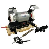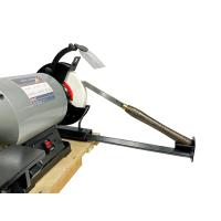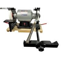 | シャープニングジグセットで木工旋盤バイトを研磨するには別途両頭グラインダーと木製ベースが必要です。 ※木製ベースはご自身で製作してください。 | 作製した木製ベースに両頭グラインダー、シャープニングジグセットを画像の様に取り付けます。このセットで大半の木工旋盤バイトは研磨する事が出来ます。 | |
