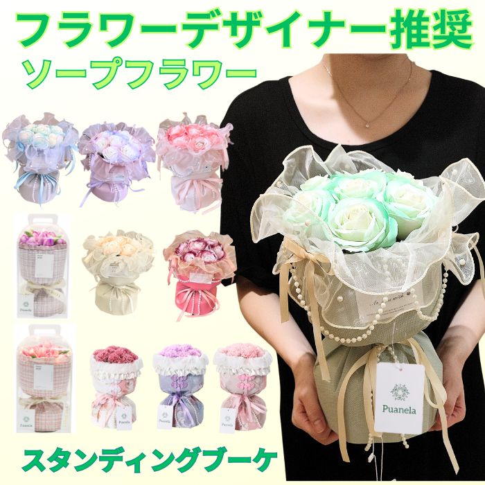 ★ご自宅用はもちろんプレゼントにも最適な商品です。1月:お正月・お年賀・成人式2月:バレンタインデー3月:卒業・卒園・退職・ひな祭り・ホワイトデー・お彼岸4月:入学・入園・就職5月:母の日・こどもの日6月:父の日・ジューンブライド7月:七夕・お中元8月:お盆のお供え・帰省土産9月:敬老の日・秋のお彼岸10月:ハロウィン11月:夫婦の日12月:お歳暮・クリスマス【その他用途】誕生日・記念日・結婚祝い・出産祝い・新築祝い・開業祝い・開店祝い・引越祝い歓送迎会・発表会・展示会・還暦祝い・古希・喜寿・米寿のお祝い・金婚式・銀婚式お見舞い・お悔み・法事 など商品の説明花業界歴20年以上のフラワーデザイナーが推奨する【Puanela】(商標登録:6641739)ソープフラワーは、大切な方の笑顔のために・・・受け取った方が幸せな気持ちになりますように・・・との願いを込めています。スタンディングタイプのブーケなので自立します。運びにも便利な窓付き紙袋付きです。様々な花材と色が揃っているので、お好みの商品を選んでお楽しみいただけます。ソープフラワーとは花びら1枚1枚上質な石鹸で作られた観賞用のお花(造花)です。1点1点手作りで温かみのある製品です。ご自宅用はもちろん、お誕生日プレゼントや各種お祝い・発表会・卒業式・母の日・敬老の日などのイベント・法事・お供えなどのフラワーギフトにピッタリです♪ 【ご使用上の注意】観賞用です!手洗い入浴にご使用にならないで下さい。時間とともに香りが薄くなります。 水濡れや多湿は避け、直射日光はお避け下さい。輸送中、万が一花が潰れていましたら回転させたり花びらをそっと起こしてカタチを整えてください。※類似品にはご注意ください。