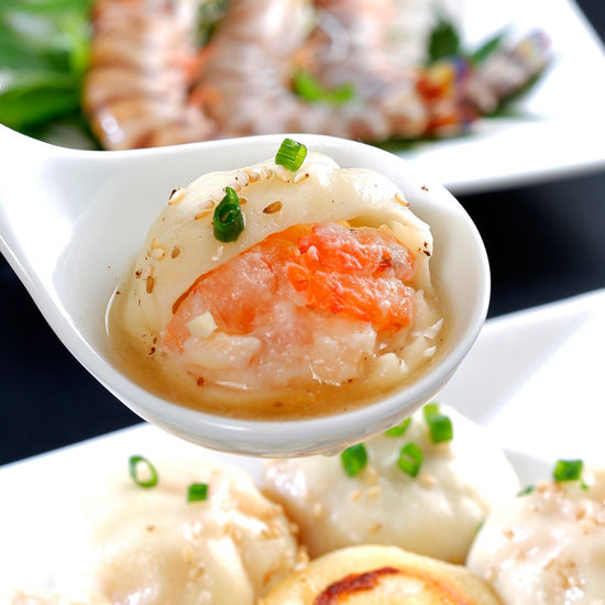 2種類の食感の違う海老を鹿児島の黒豚などを煮込んだ上質のコラーゲンスープと一緒に食感にこだわった皮で包んだ海老焼小籠包です。