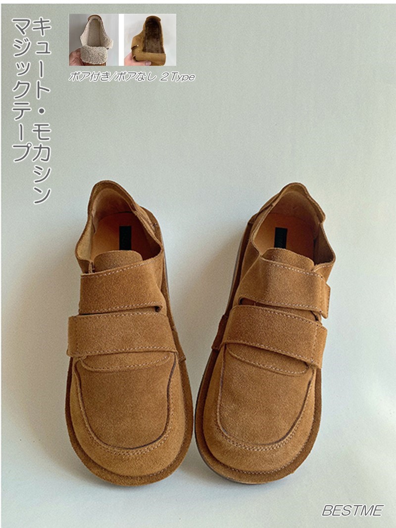 送料無料 モカシン フラットシューズ 森ガール スエードシューズ マジックテープ 靴 春秋 冬 カジュアル 楽ちん シューズ レトロ 可愛い 滑り止め ボア付き
