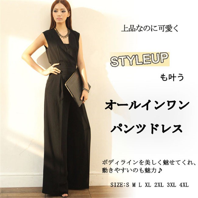 送料無料 オールインワン パンツドレス パーティードレス Vネック レディース サロペット ガウチョパンツ ノースリーブ コンビネゾン フォーマル 結婚式
