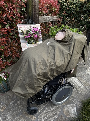 車椅子に乗ったまま、上からかぶって装着。ゴムのシャーリングをフットレストにひっかけて首を出すだけ。後ろは紐でしばるだけ自由に調節可能。フードも付きで、手間いらず。透湿防水 大雨レベルでも 大丈夫。車椅子に座った状態で首の付け根よりフットレストまで直線距離で <レギュラー>約95〜115cm 車椅子座幅 約32〜40cm(布118cm巾)<ロング丈>前と後ろに+30センチ丈が長く、横幅138センチ 取っ手ボタン付き 車いすの取っ手用(後ろ側)と車いす乗車本人用(両手側)にボタンが付き&収納出来る袋付き。ループも付いているので、掛けられます。透湿防水ナイロン生地100% 水は通さず、湿度は通す優れた生地 耐水圧8000mm 大雨レベル 軽量でサラサラした生地 着心地も良く 蒸れない 表面は撥水もします。お出かけ 旅行 遠足 校外学習 修学旅行に1つはあると便利。カバンの中に小さくしまっておけるポーチ付き。車椅子やベビーカーに。学用品として「特別支援教育就学奨励費」として申請可能です。
