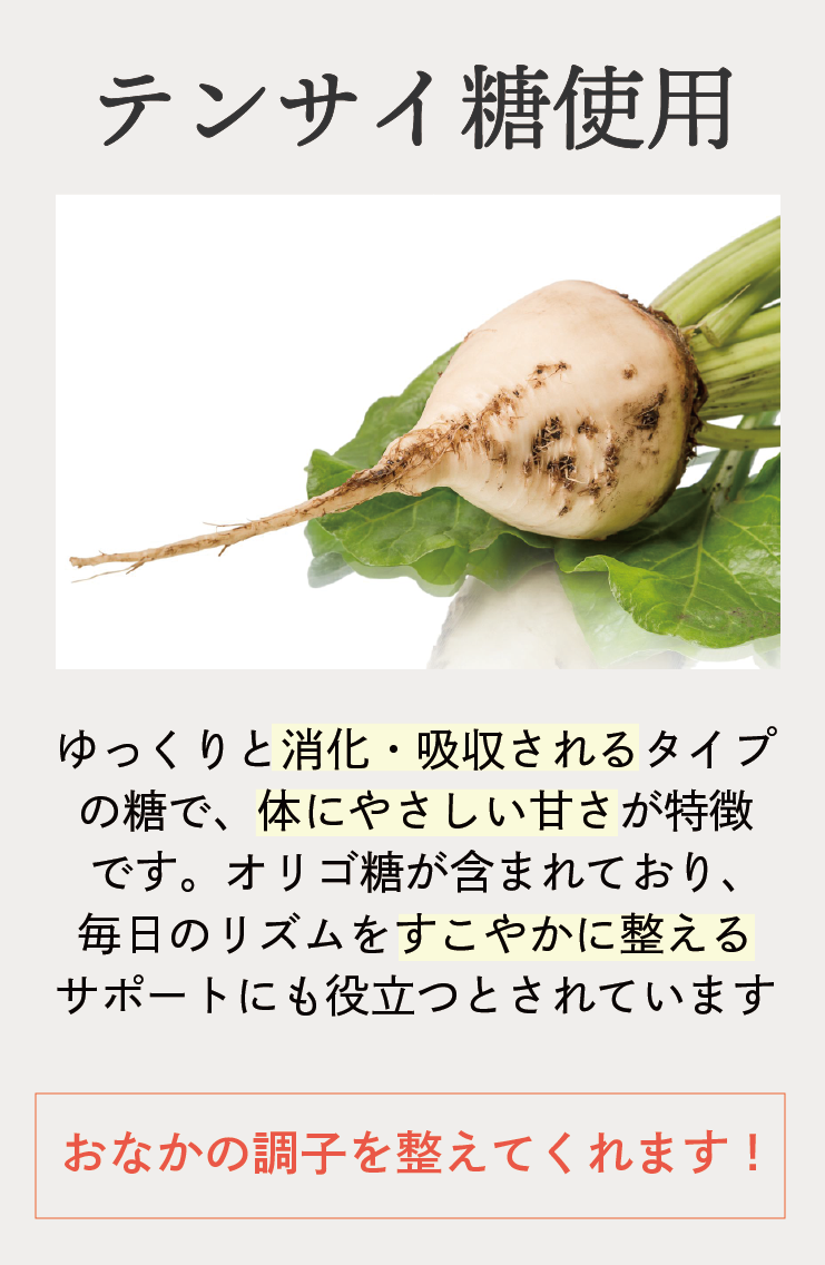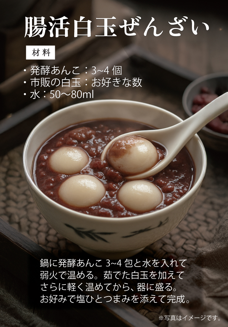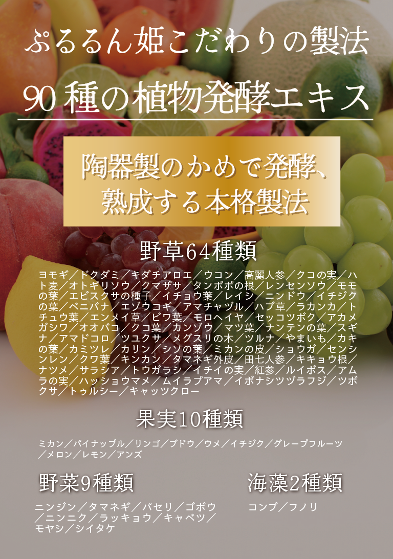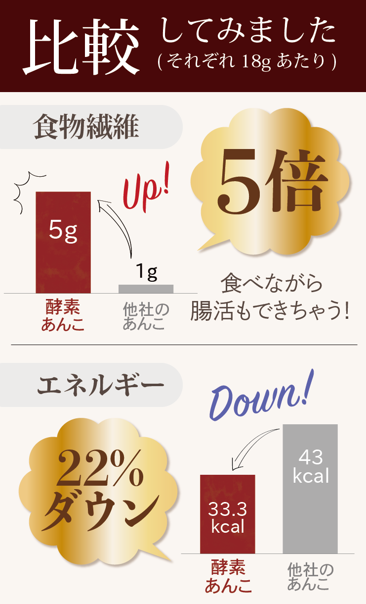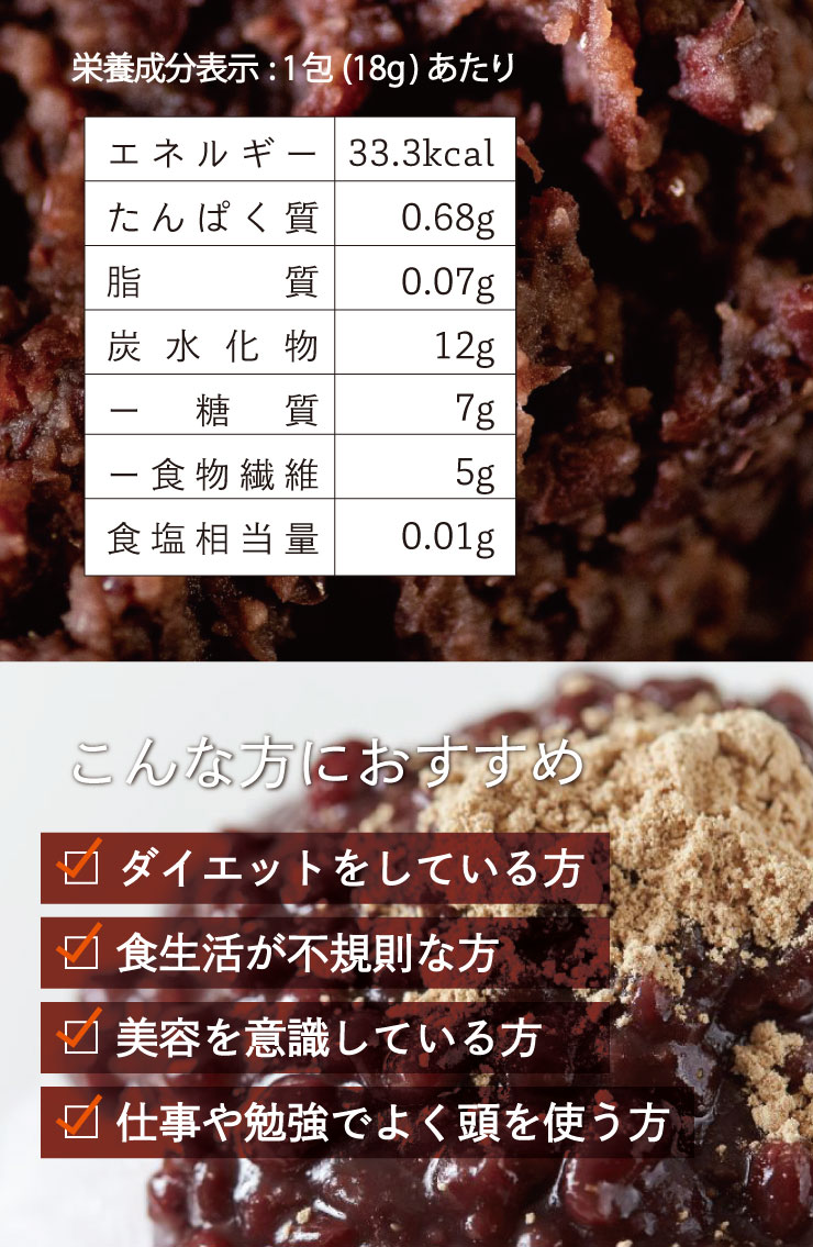 | 原材料名 | 水溶性食物繊維(国内製造)、小豆、てんさい糖、寒天粉、蒟蒻粉、おからパウダー、米麹パウダー、90種植物発酵エキス(一部に大豆、りんご、やまいもを含む) |