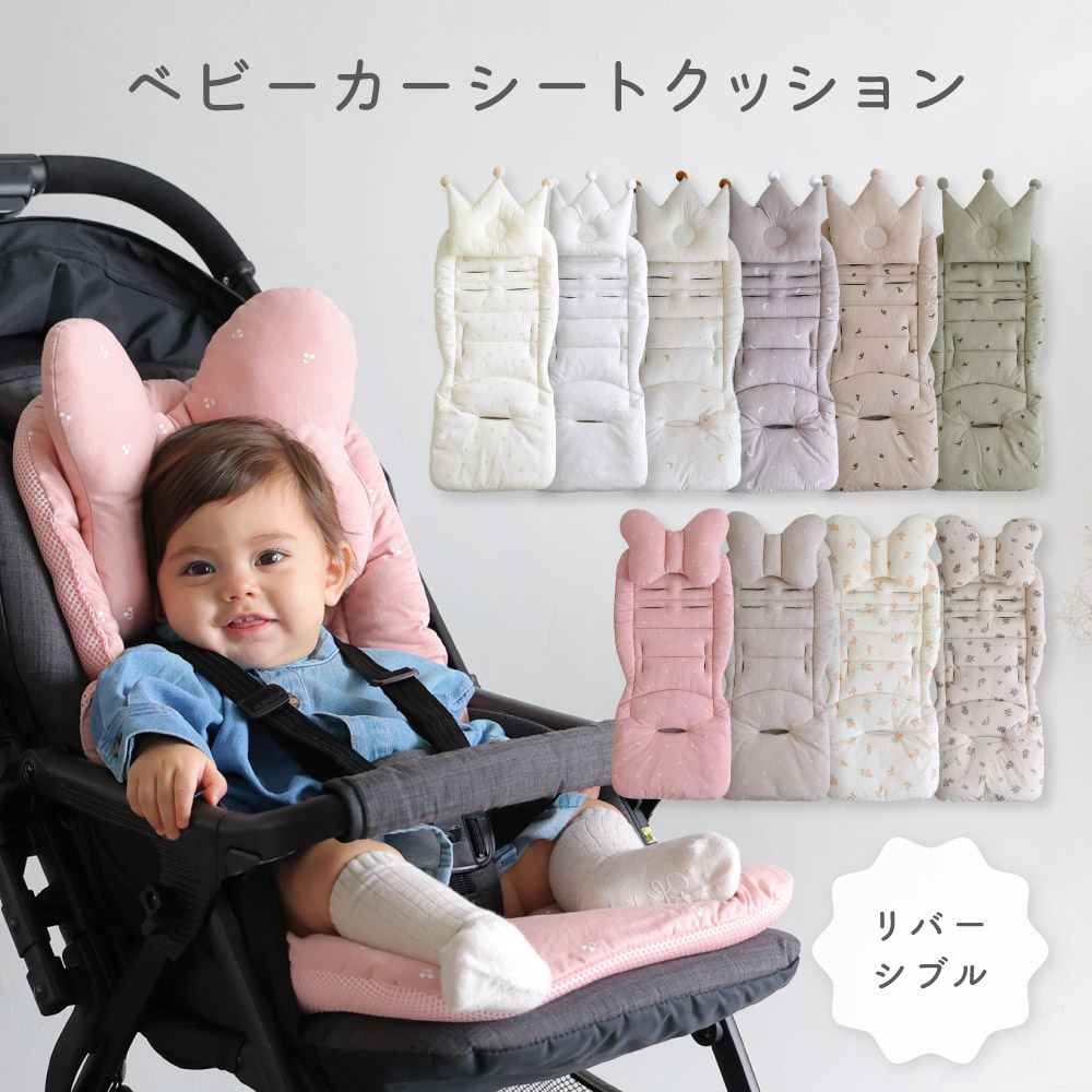 ヘッドクッションの形を真ん中くぼみでかわいいポンポン付きの「王冠」型と両サイドをやさしくガードするかわいい「リボン」型にしました。取り外しも、位置変更もできるので月齢やベビーカーの種類等に合わせてお使いいただけます。