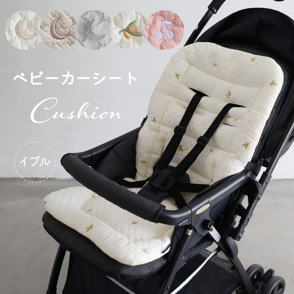 ベビーカー本体への汚れ防止にもなるふんわりクッション性のあるイブルモロッカン生地に北欧風刺繍デザインのベビーカー用クッション。