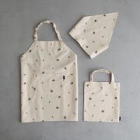 子供用エプロン・三角巾・専用バッグの3点セット。表面はっ水加工で脱ぎ着もカンタンな被るだけのエプロンは、お洋服を選ぶ感覚で選べるおしゃれなくすみカラーで、見た目もかわいいナチュラルモチーフイラストのデザイン。