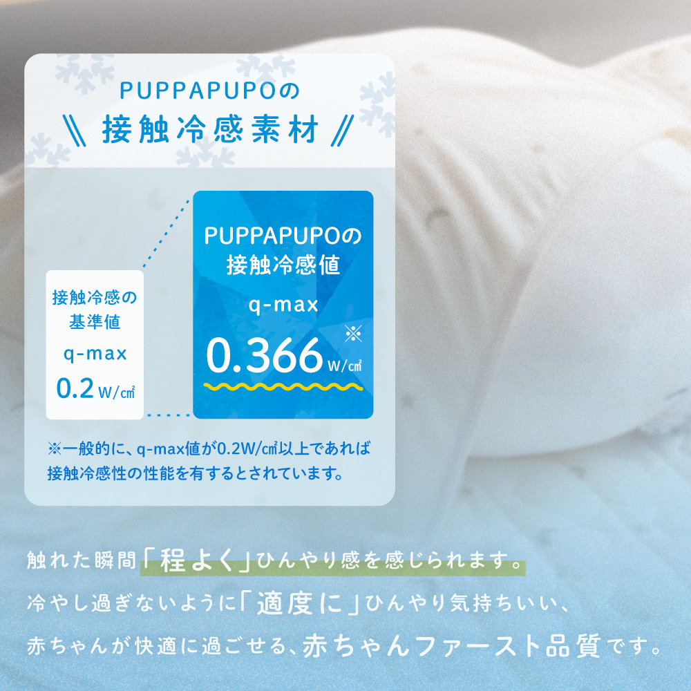 PUPPAPUPOの接触冷感素材はq-max値【約0.366 W/cm 】で触れた瞬間「程よく」ひんやり感を感じられます。冷やし過ぎないように「適度に」ひんやり気持ちいい、赤ちゃんが快適に過ごせる、赤ちゃんファースト品質です。※一般的に、q-max値が0.2W/以上であれば、接触冷感性の性能を有するとされています。