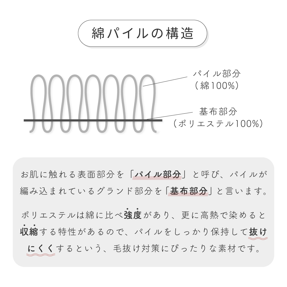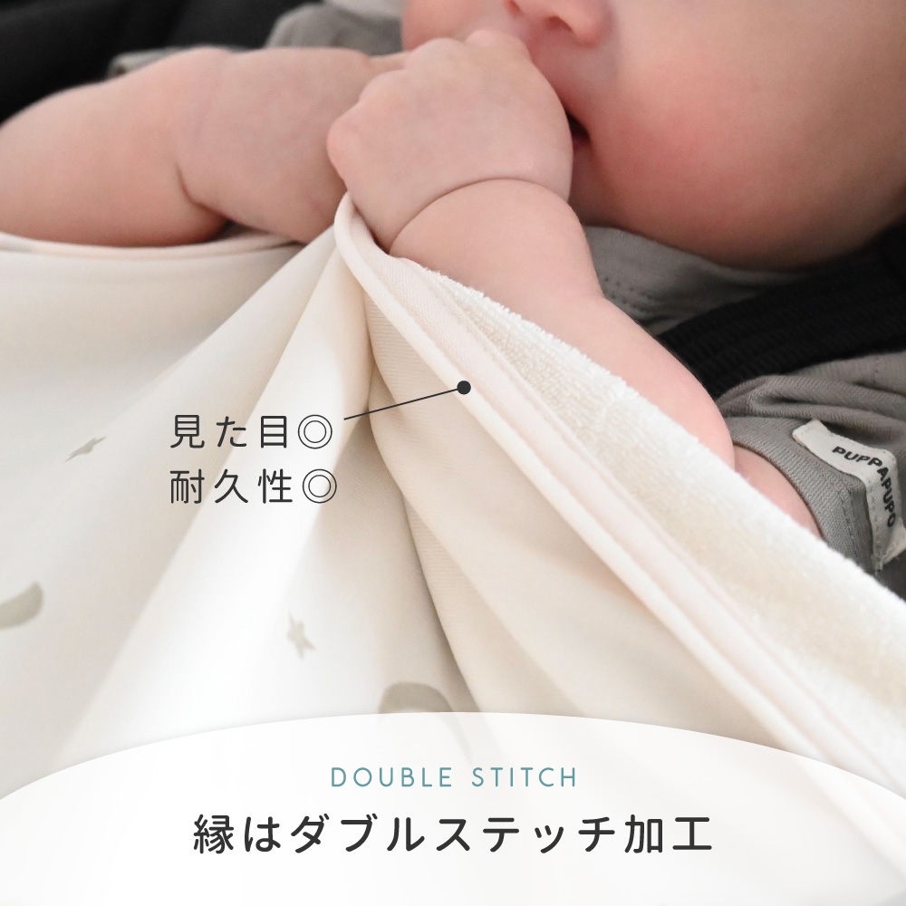 もう1面はふんわりやさしい肌ざわりでコットンパイル素材を採用。伸縮性もあって吸水性・通気性もある「パイル」は汗っかきのベビちゃんにはぴったりの素材です。※パイル生地はパイル部分 綿100%、基布部分 ポリエステル100%になります。
