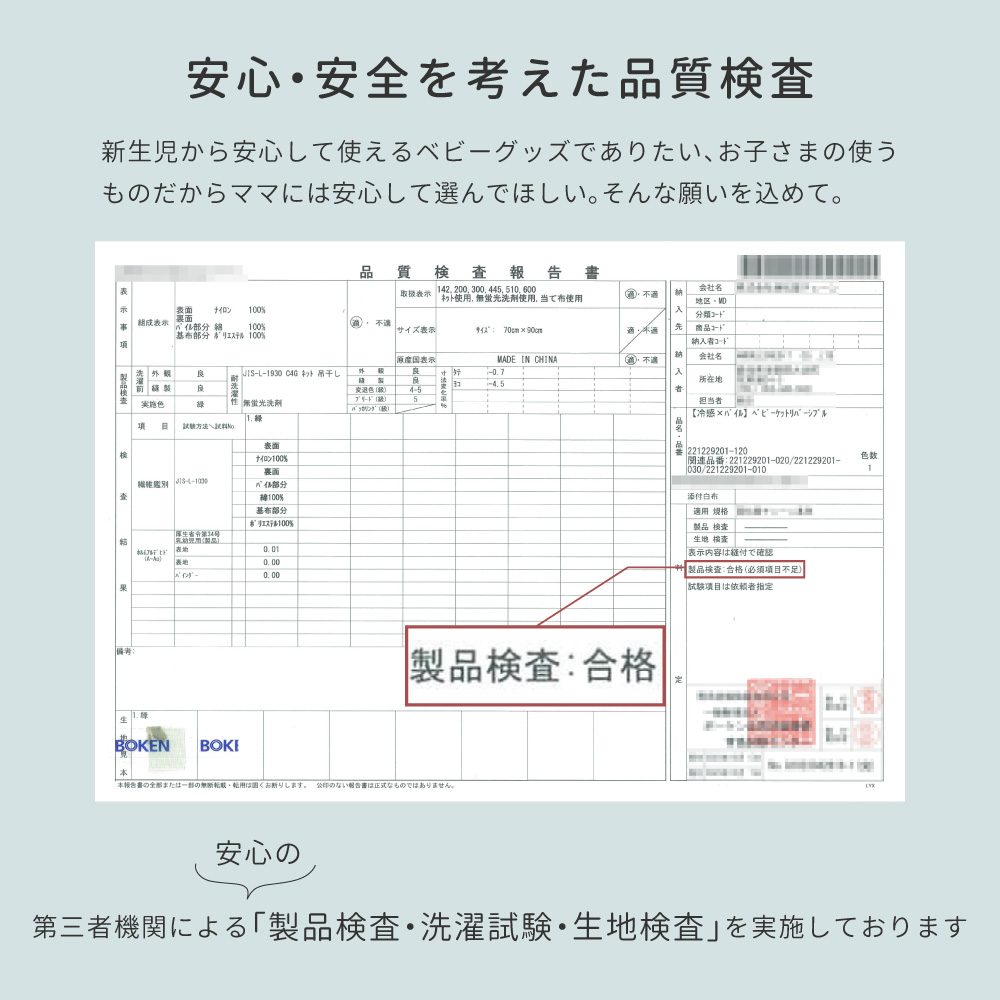 新生児から安心して使えるベビーグッズでありたい、お子さまの使うものだからママには安心して選んでほしい。当店の製品は第三者機関による「製品検査・洗濯試験・生地検査」を実施しております。