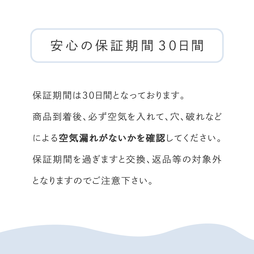 保証期間は30日間となっております。商品到着後、必ず空気を入れて、穴、破れなどによる空気漏れがないかを確認してください。保証期間を過ぎますと交換、返品等の対象外となりますのでご注意下さい。
