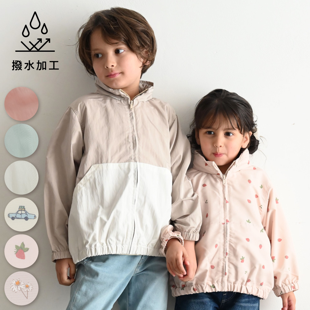 防寒にもピッタリな大きめフード付き。保育園や小さい子供には安全面を考慮してフード不要な場合は襟元にサッと丸めて収納ができ、フードなしのナイロンジャケットに早変わり。※柄物はポリエステル100%になります。