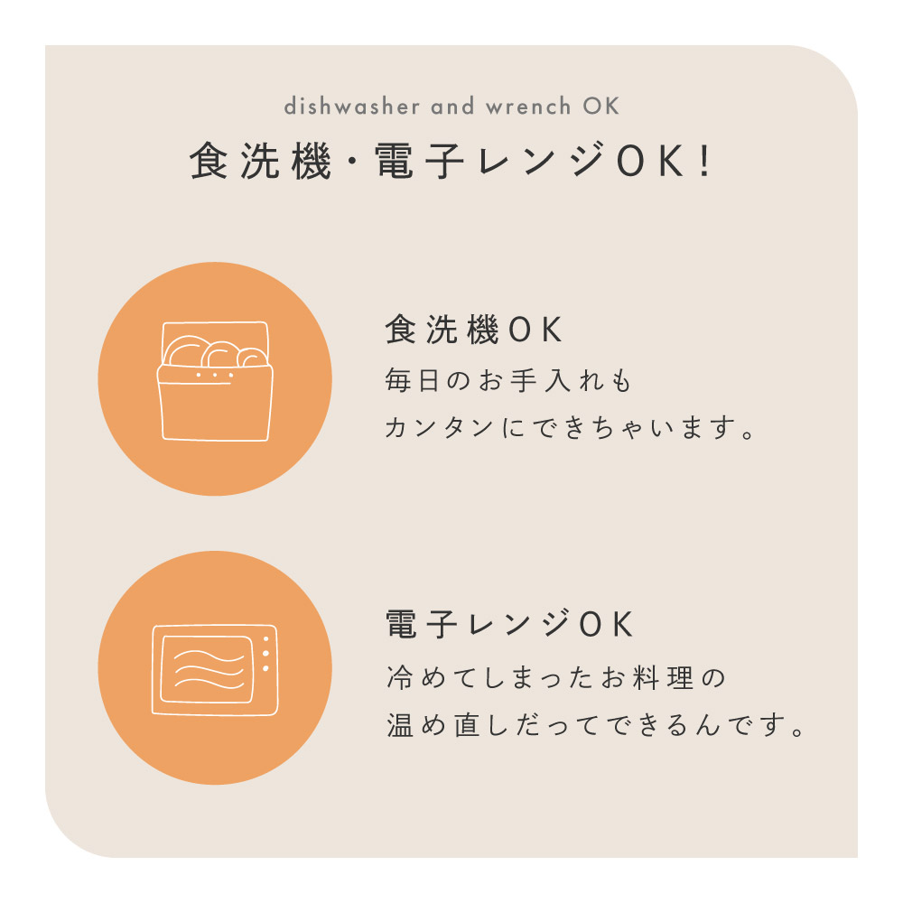 忙しい育児には強い味方の食洗機にも対応。毎日のお手入れもカンタンにできちゃいます。もちろん電子レンジもOK!冷めてしまったお料理の温め直しだってできるんです。