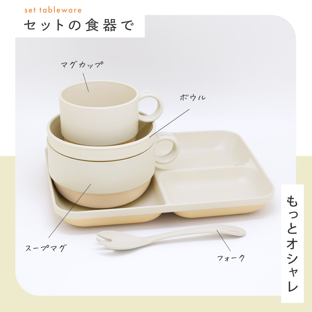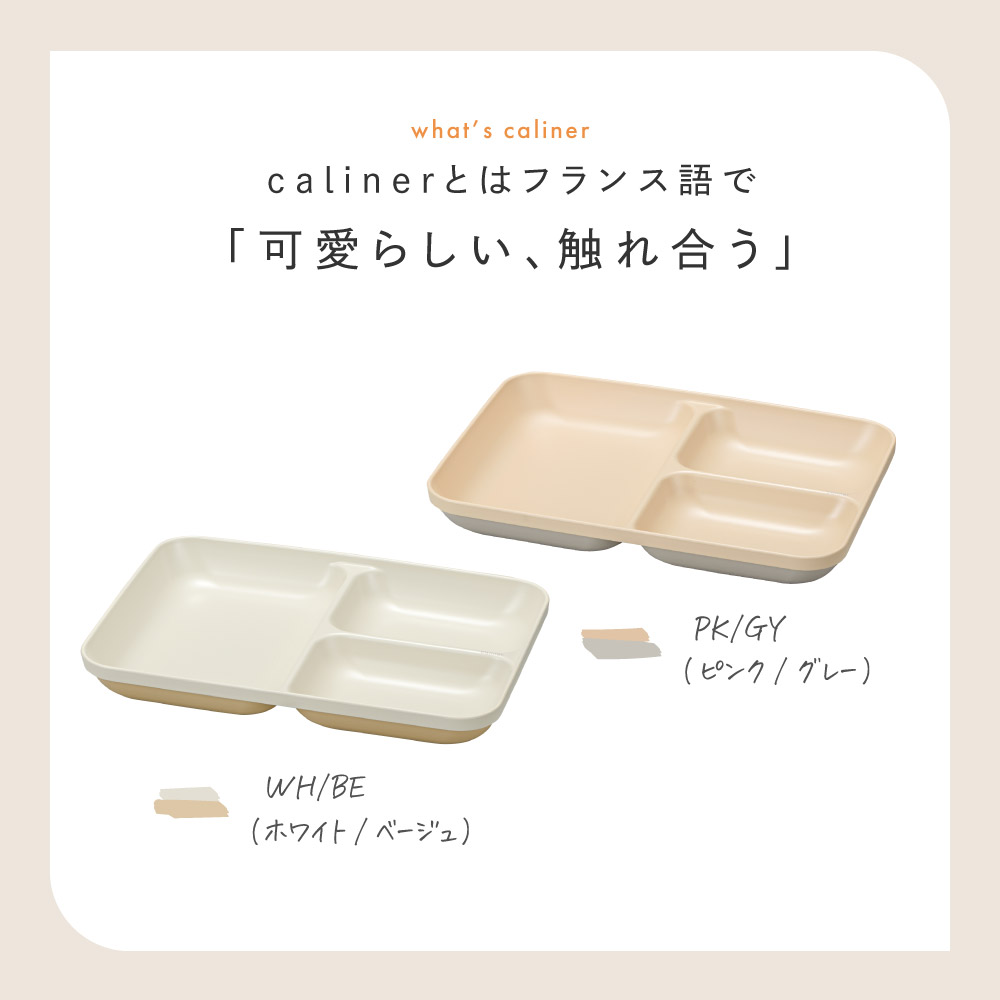 calinerとはフランス語で「可愛らしい、触れ合う」という意味。淡く優しい2つの色が重なり合った、優しい色合いがお子さまとのお食事タイムをあたたかく彩ります。