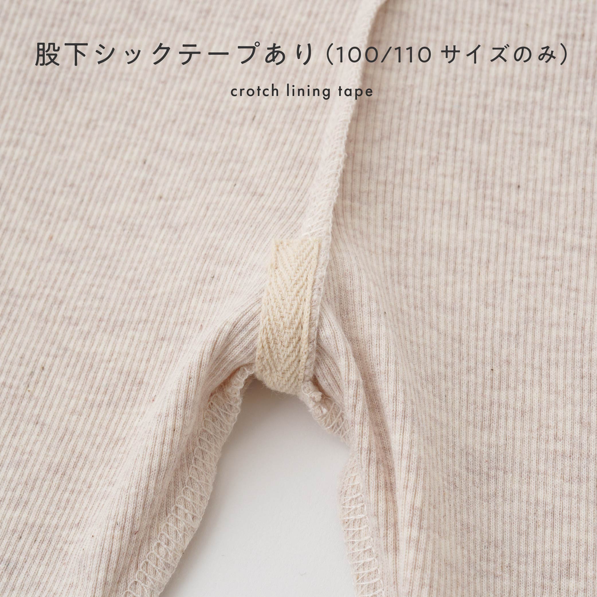 あるのとないのとでは大違い、動きもアクティブになる100サイズと110サイズは耐久性を考えた、股下シックテープ付き。