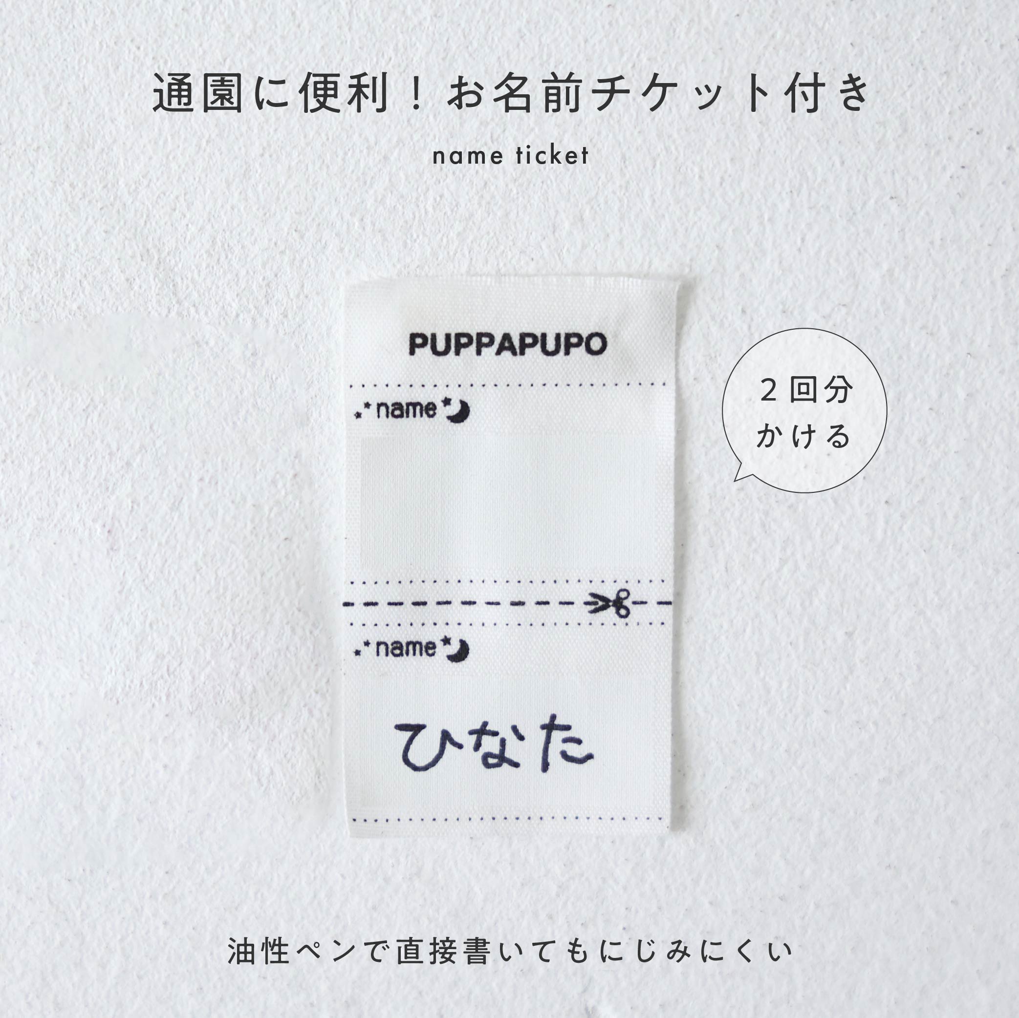 保育園や幼稚園では入園案内で、入園準備として持ち物にはすべて記名をするのが基本、衣服ももちろん対象なんです。PUPPAPUPOのお名前チケットは油性ペンで直接書いてもにじみにくく、さらに、このチケットは2ヶ所(2回分)書けるタイプなので、お下がりで使う際は、不要になった部分をカットするだけでOK。アイロンで貼り付けるお名前シールを用意する必要がありません。