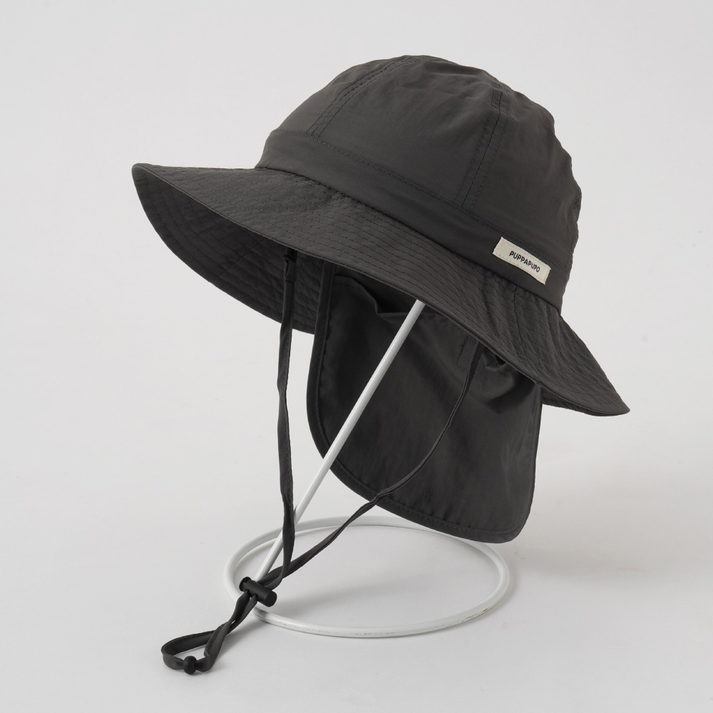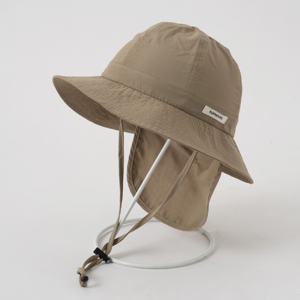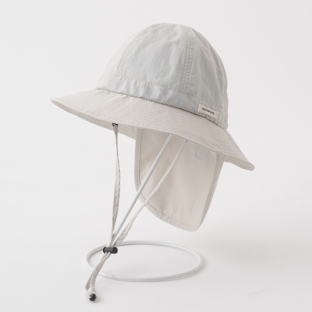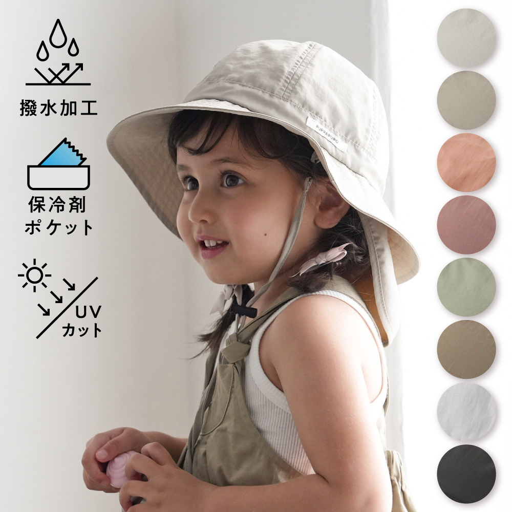 首後ろまでしっかり日焼け対策できるネックシェード付き。ボタンで取り外しOK、ポケット付きで保冷ジェルが入れられます。ポケットの内側は保冷剤が溶けても水滴がつきにくいウレタンコーティング加工。