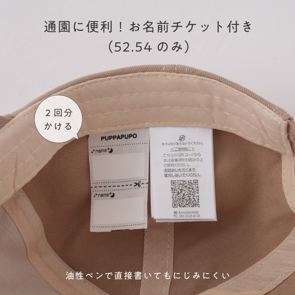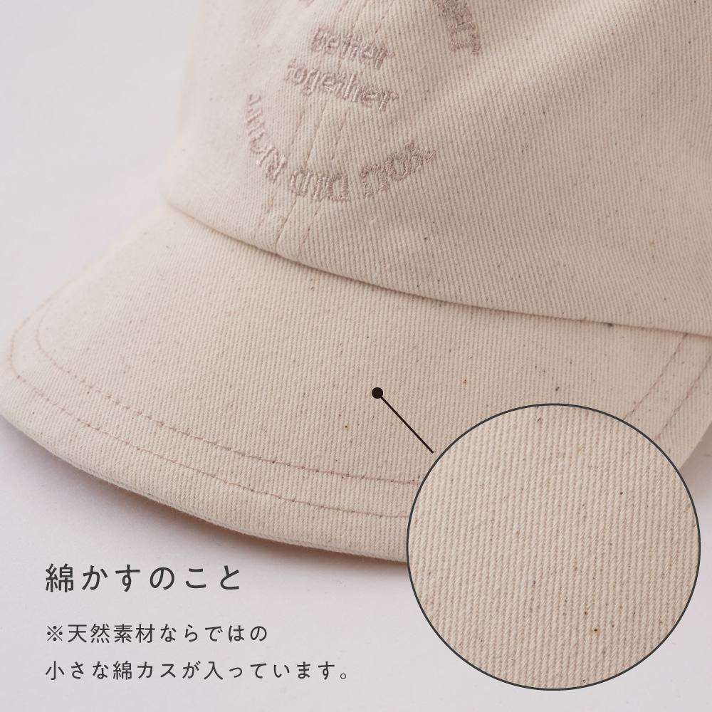 本体はふんわりやわらかく優しい被り心地のツイル素材。ベビー・キッズの帽子として、重すぎない程よい厚みなので、長いシーズンお使いいただけます。