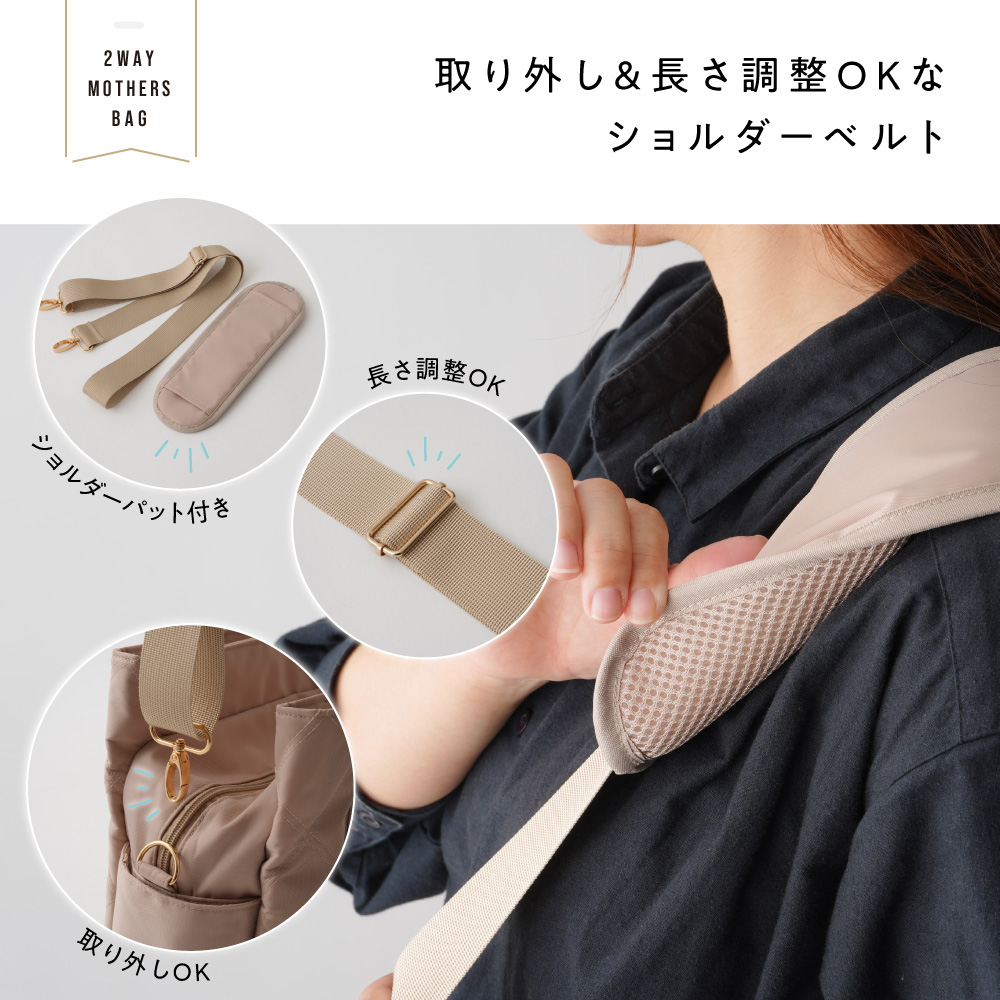 赤ちゃんを抱っこしながらでも手が自由に使えるショルダーバッグタイプと、ちょっとのお出かけにサッと手持ちにしてトートバッグタイプにもなる2way仕様、程よい幅の持ち手はベビーカーフックなどにもかけられます。取り外しできる太めのショルダー用のベルト(クッション入りのパッド付き)で肩の負担を少しでも軽減。