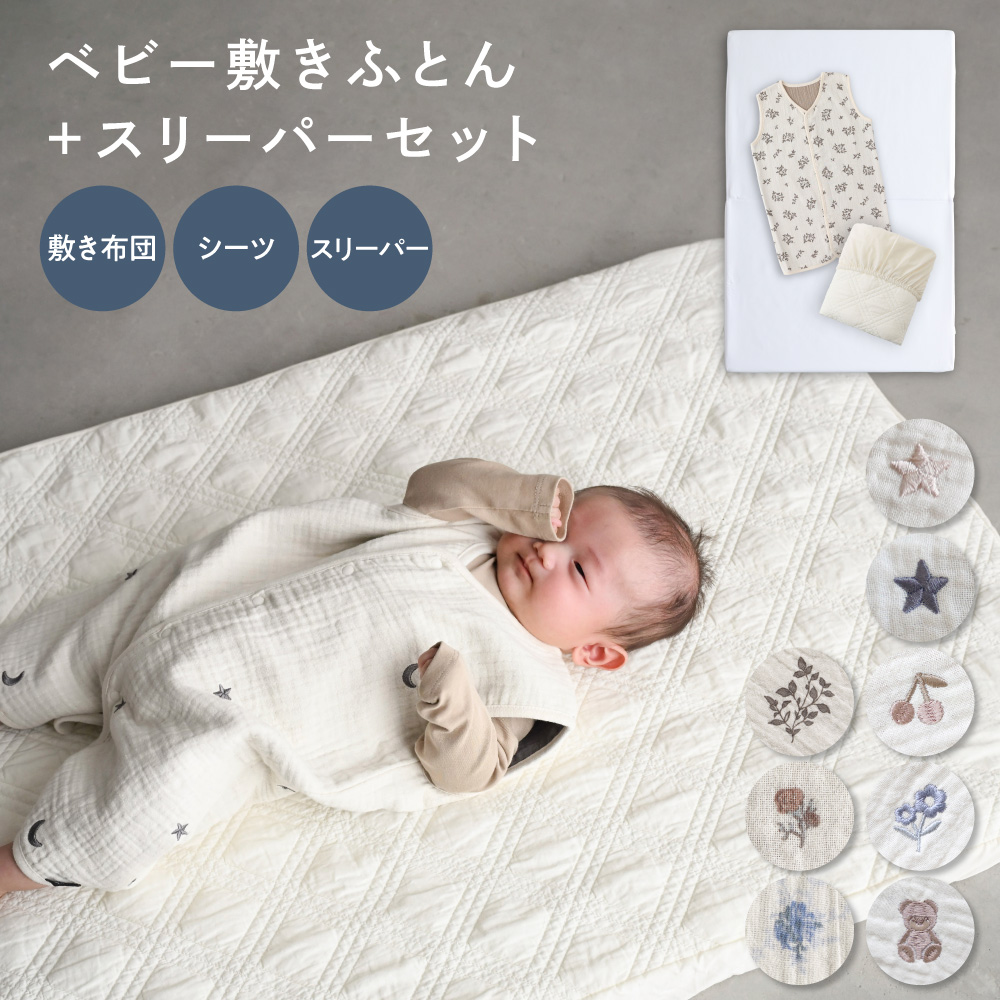 敷き布団・フィッティングシーツ・ガーゼスリーパーSサイズのシンプルなベビー布団セットが登場しました。近年ご要望の多い“掛け布団と枕なし”のスタイルに、掛け布団代わりのスリーパーを組み合わせたおやすみ3点セット。敷き布団の種類・サイズ、スリーパーの厚み・色柄をお選びいただけます。