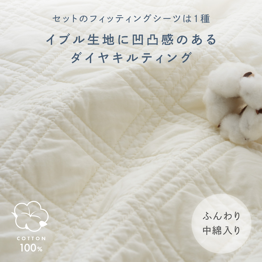 フィッティングシーツの表生地はやさしい肌触りの赤ちゃんにうれしい綿(コットン)100%のイブル生地に凹凸感のあるダイヤキルティング。中綿入りで赤ちゃんをふんわり包み込みます。「イブル」は韓国ではお布団の総称で、見た目のかわいさだけでなく「肌触り抜群・軽い・お洗濯後の乾きが早い」というたくさんのメリットがあります。イブル生地ならではの風合いと絶妙な色味が、お部屋の雰囲気にも馴染みやすいインテリア寄りなデザインです。