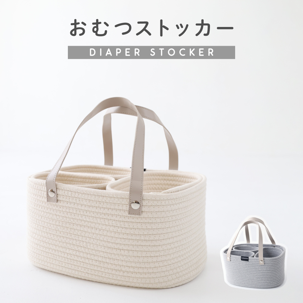 ナチュラルでおしゃれなママ目線おむつストッカー。仕切りをやめてあえて独立型のボックスを入れることで使いたいものを使いたいときに簡単に取り出せるという画期的な仕様にしました。本体素材も合皮の持ち手も絶妙な、こだわりデザインです。