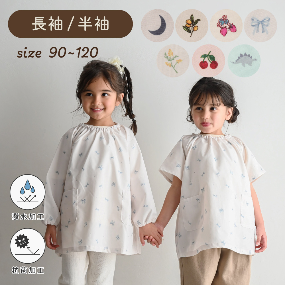 撥水加工生地だからいろいろなシーンで。保育園・幼稚園はもちろん、お絵描きやのりなどを使う工作の時も、お外でのお砂場遊びや水遊びも、お料理やお風呂掃除などママのお手伝いの時も、もちろんご飯の時のエプロンとしても、いろいろなところで大活躍。120サイズまであるので小学生のお習字の墨はね対策や調理実習のエプロンとしてもお使いいただけます。