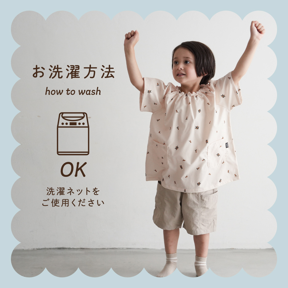 抗菌効果が持続する生地を使用しており、菌の増殖をしっかり抑えてくれます。泥んこ遊びや汗で汚れが気になるシーンでも、衛生面で安心できる心強いスモックです。