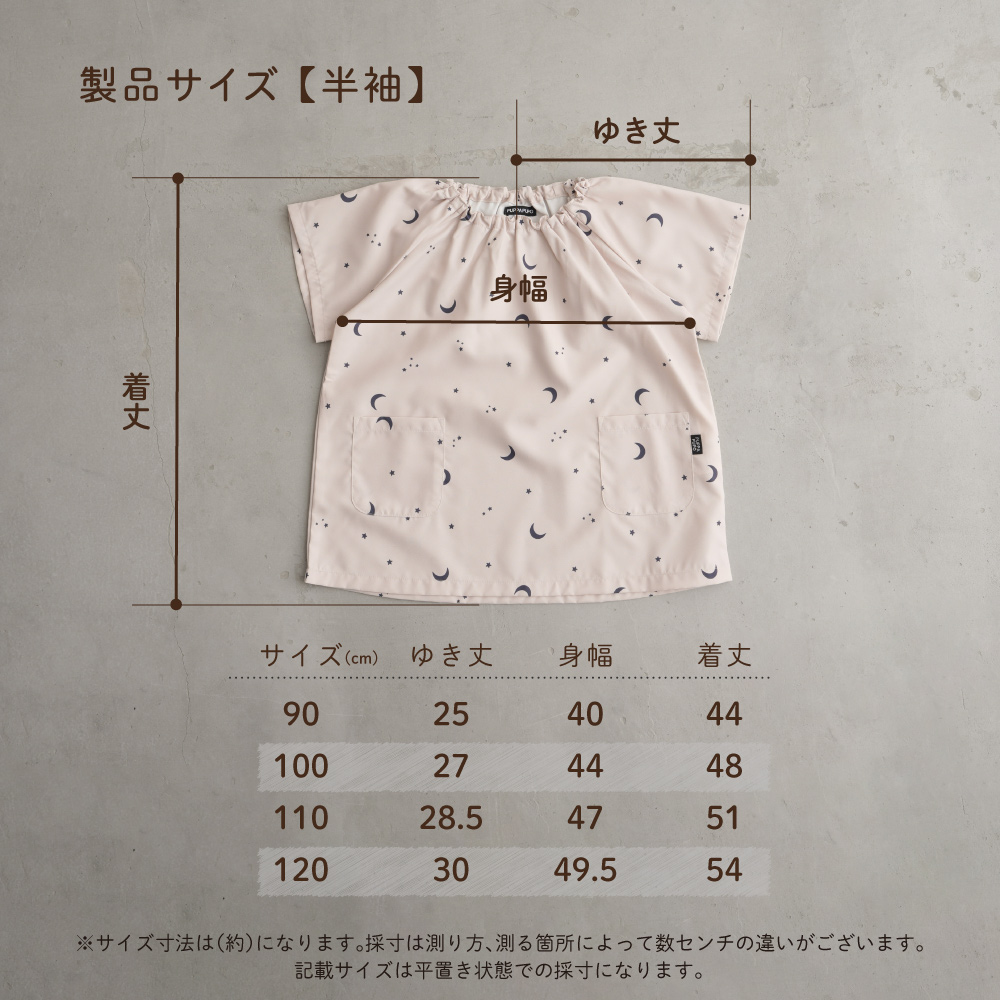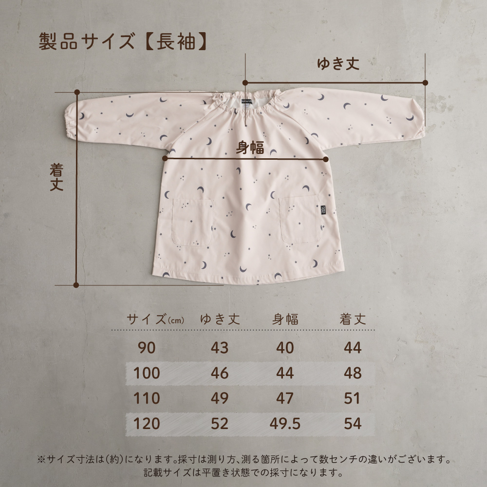 90、100、110、120サイズまでの4サイズ展開。少し大きめの作りになっているので、ジャストサイズでも多少ゆったり着れるのがうれしいですね。長く着てほしい、モモまでゆったり着せたい時には1〜2サイズ上のものを選ぶのもおススメです。